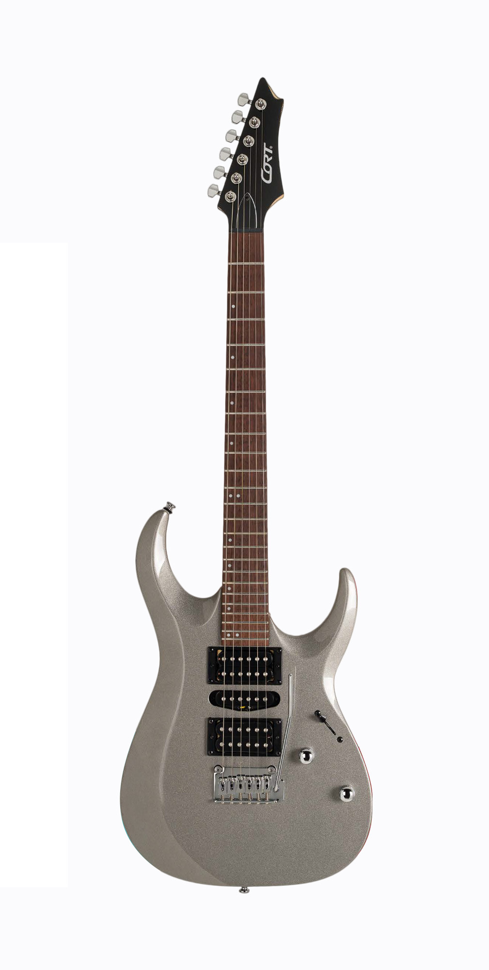 Son système de trémolo à 2 points apporte de la souplesse dans le jeu, et ses micros Cort Powersound en configuration H-S-H permettent d’explorer une large palette de sons. Avec un sélecteur 5 positions, un volume et une tonalité, elle offre des réglages simples et efficaces. Les mécaniques à bain d’huile, l’accastillage chromé et la finition gris brillant complètent un ensemble à la fois fonctionnel et soigné.