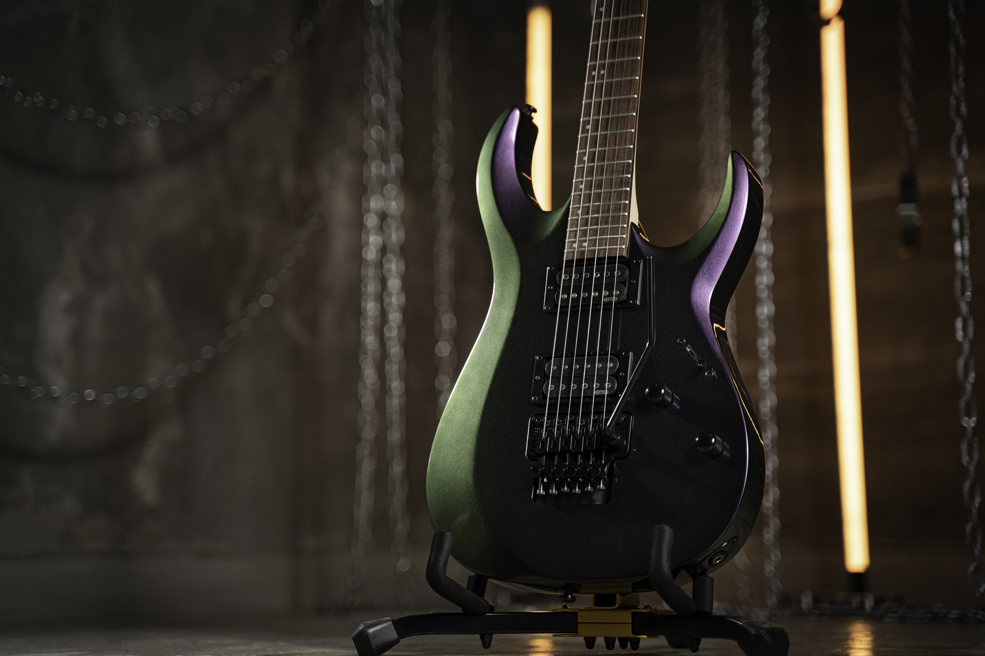 Équipé d’un vibrato Floyd Rose et de deux micros EMG RetroActive Hot70, il permet d’explorer des registres sonores dynamiques avec une bonne polyvalence. Sa configuration comprend 24 frettes, un sélecteur 3 positions, un volume et une tonalité, ainsi que des mécaniques bain d’huile pour un accordage soigné. L’accastillage noir et la finition flip purple apportent une identité visuelle marquée, tandis que les cordes D’Addario EXL 120 complètent l’ensemble.
