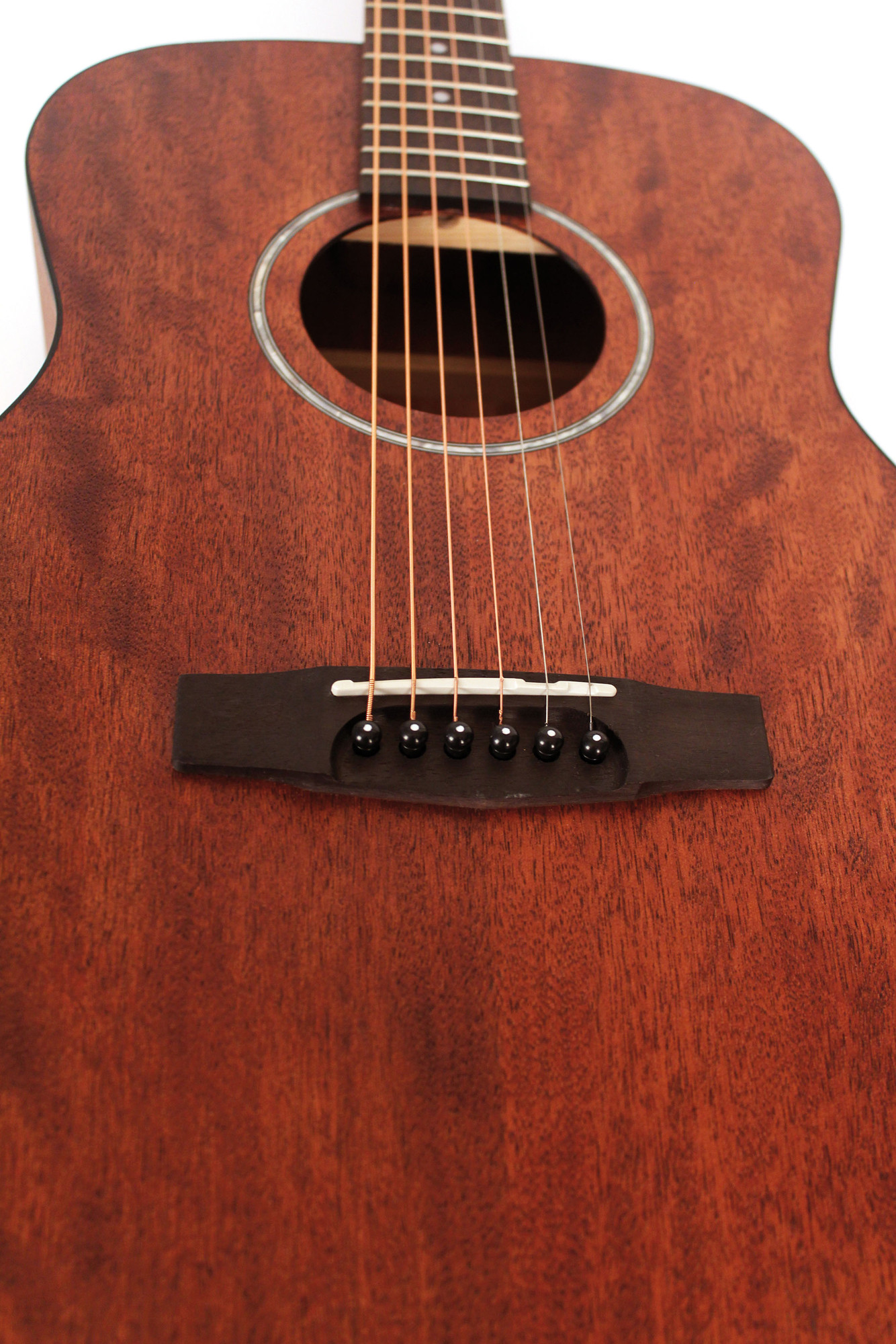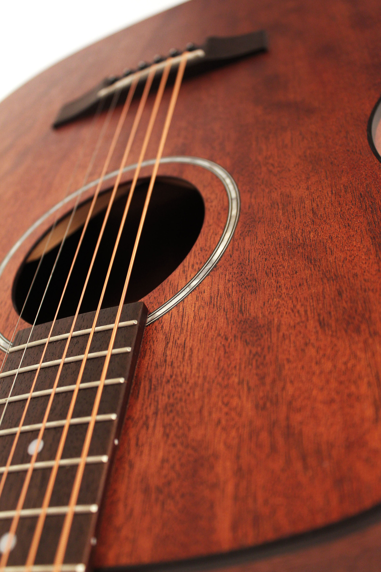 Sa conception en acajou pour la table, le fond, les éclisses et le manche, associée à une touche et un chevalet en merbau, met en avant des matériaux cohérents et une finition naturelle à pores ouverts.