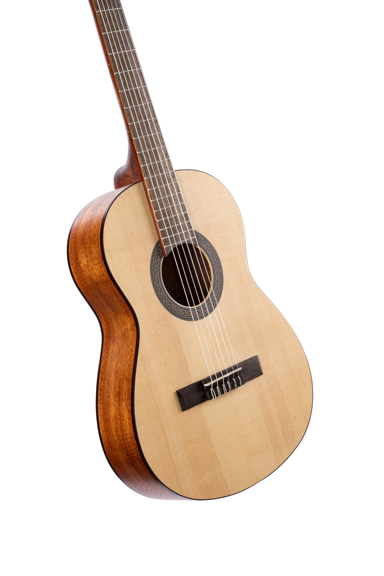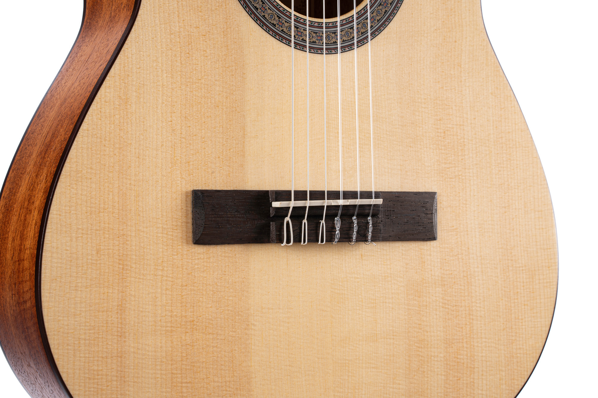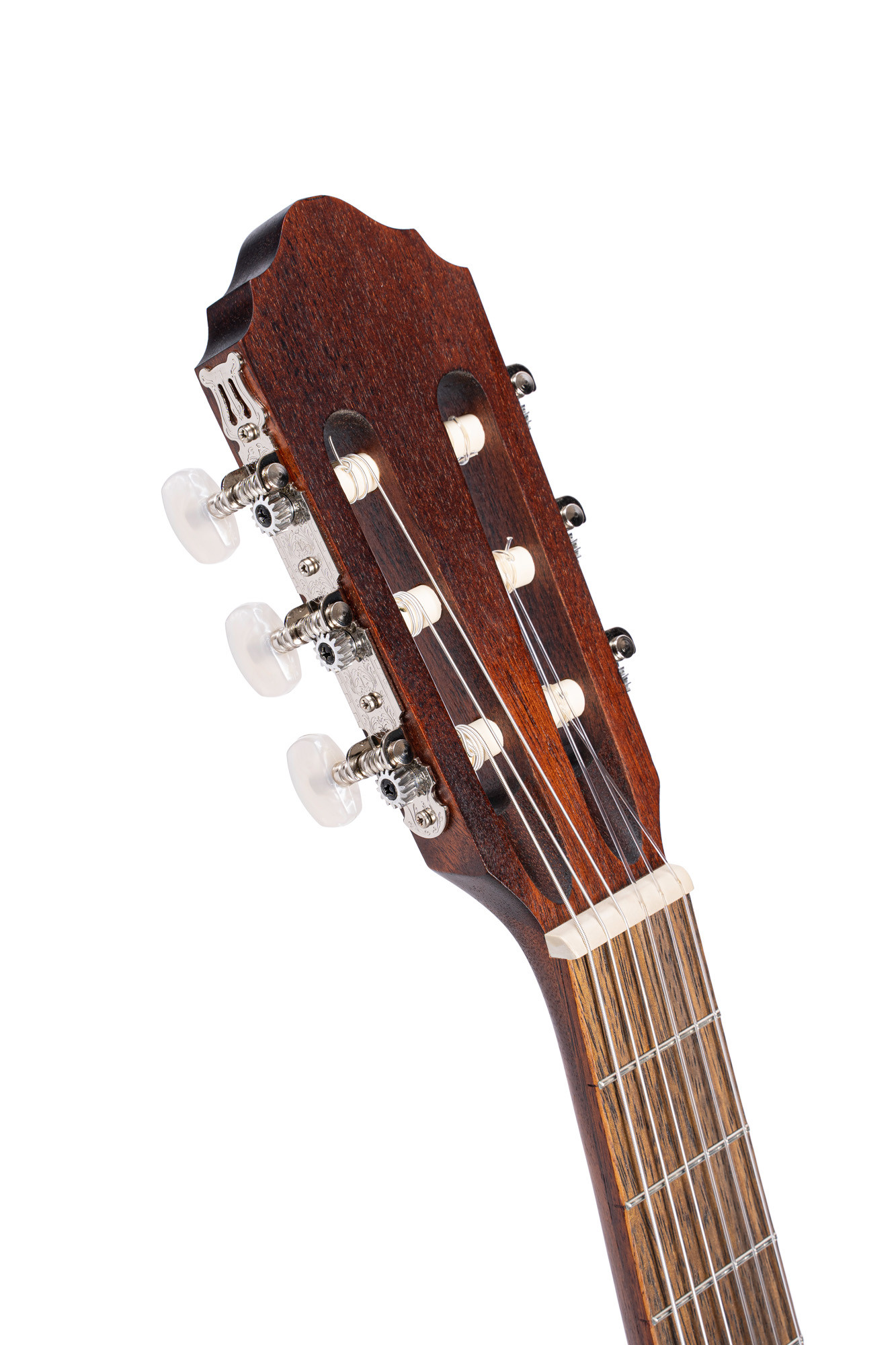 Cette guitare classique 3/4 est conçue pour offrir un format compact, pratique et agréable à jouer. Elle dispose d’une table en épicéa massif, d’un fond et d’éclisses en acajou, ainsi que d’un manche en acajou. La touche et le chevalet en merbau, le sillet de 45 mm, les sillets PPS et les cordes Savarez Cristal Corum complètent l’ensemble. La finition naturel à pores ouverts met en valeur l’aspect du bois, et la housse incluse facilite le transport et le rangement.