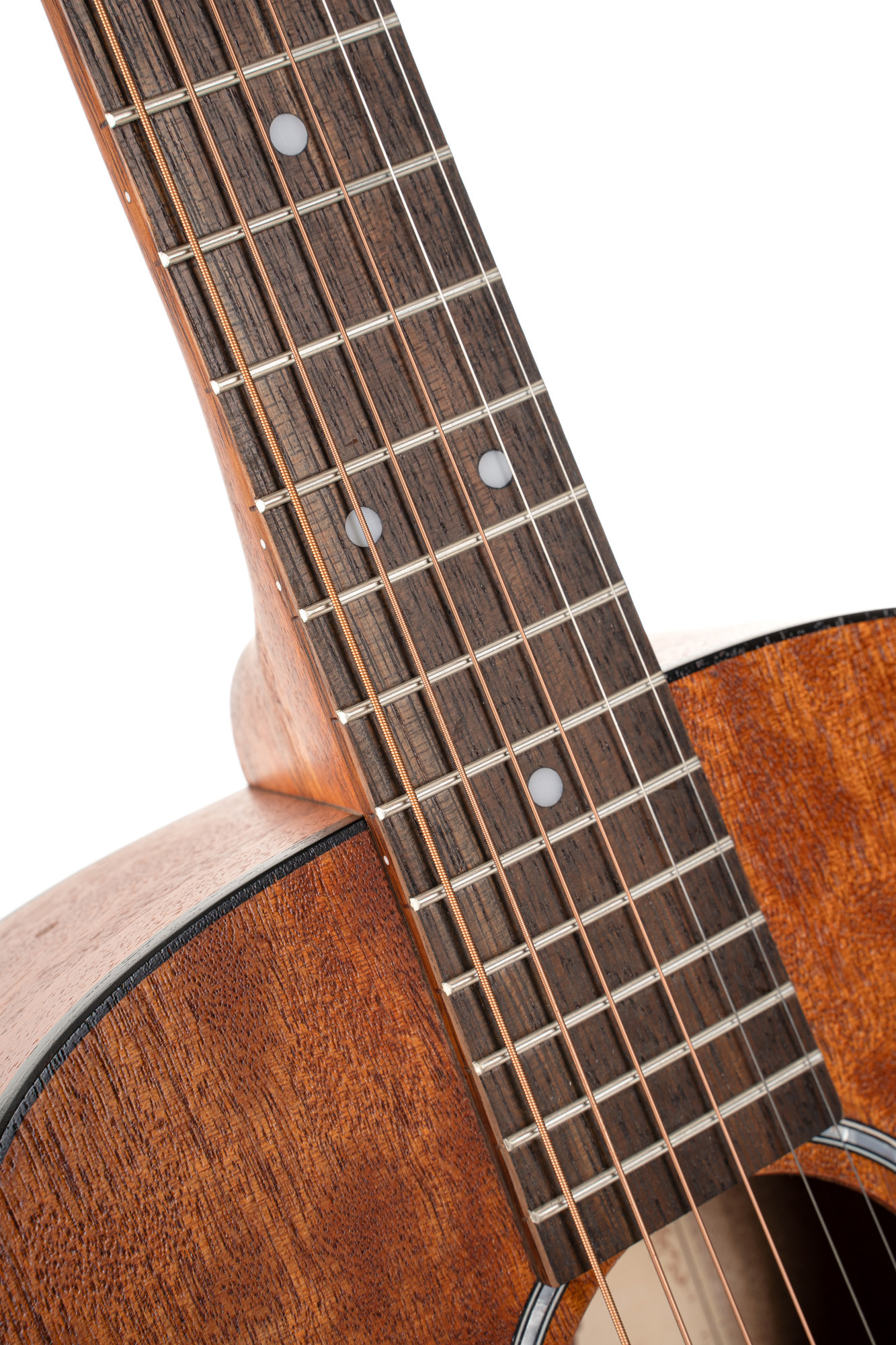 Cette guitare format dreadnought 3/4 est conçue pour offrir un instrument compact et confortable, adapté à ceux qui recherchent un modèle facile à prendre en main. Elle dispose d’un diapason de 579 mm, d’une table en acajou, ainsi que d’un fond et d’éclisses en acajou pour une construction homogène. La touche et le chevalet en merbau, les 19 frettes et le sillet de 43 mm complètent l’ensemble. La rosace blanche nacrée apporte une finition soignée. Une housse est incluse.