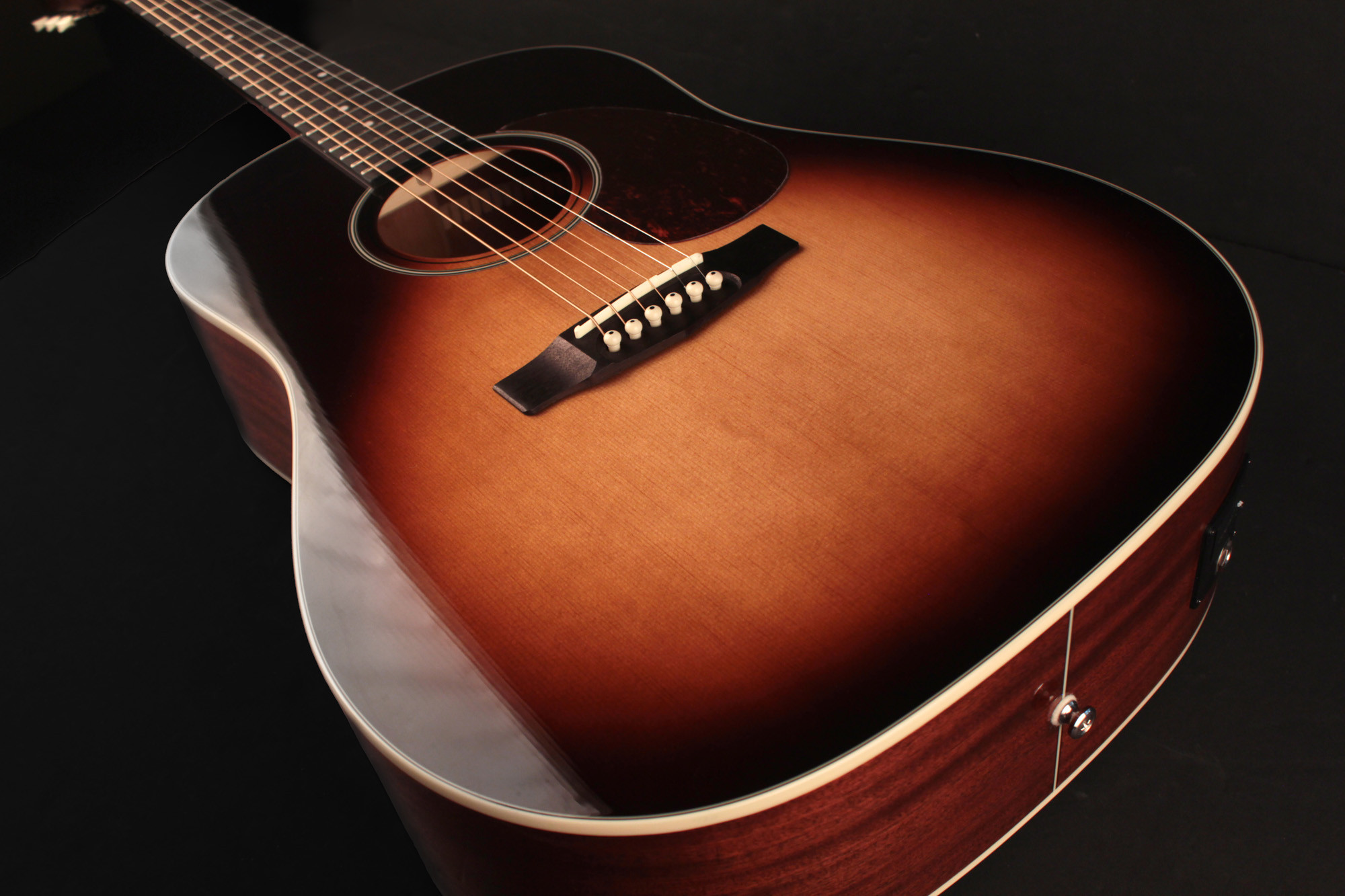 Modèle Slope Shoulder avec table en épicéa Sitka massif, fond et éclisses en acajou, équipée d’un EQ Fishman Sonitone, finition sunburst.
