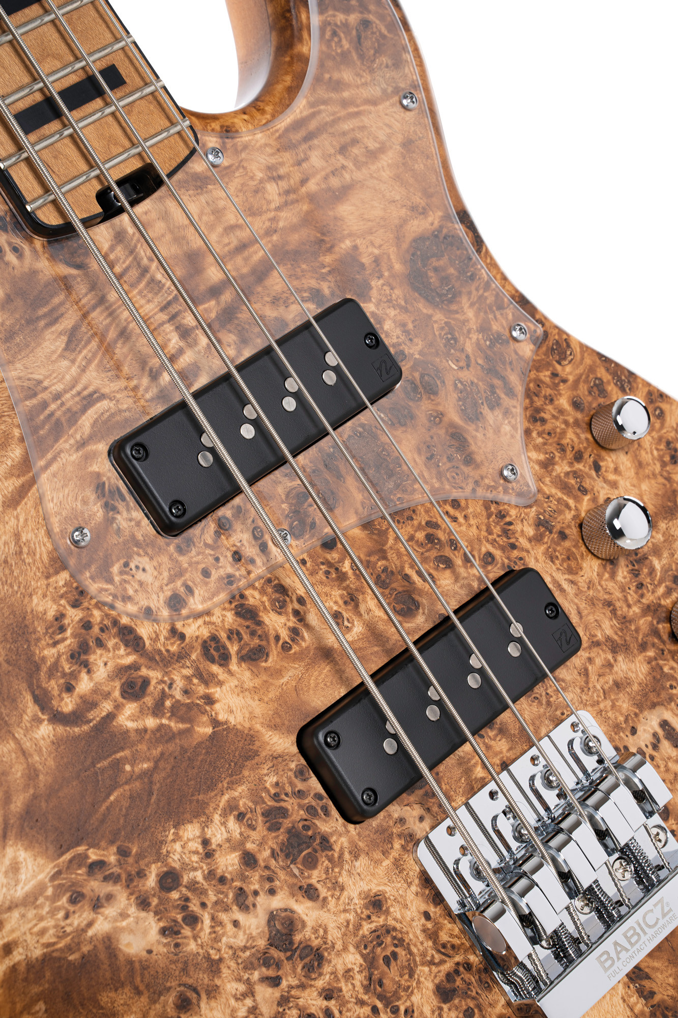 Son électronique comprend deux micros Nordstrand Big Single et un préampli MarkBass MB actif/passif, offrant une configuration complète pour s’adapter à différents usages. L’instrument dispose également d’un chevalet Babicz FCH, de mécaniques Hipshot Ultralite, d’un accastillage chromé et est livré avec des cordes D'Addario XL 165 ainsi qu’un soft case Deluxe.