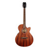 Ce modèle présente une conception en acajou avec une table en acajou, ainsi que le fond et les éclisses en acajou pour une construction homogène. Le manche est également en acajou, tandis que la touche et le chevalet sont en merbau. Il dispose de 20 frettes, d’un sillet de 43 mm, d’une rosace nacrée, d’un binding noir et d’un système d’amplification Cort CE304T. La finition naturelle à pores ouverts met en valeur l’aspect du bois.