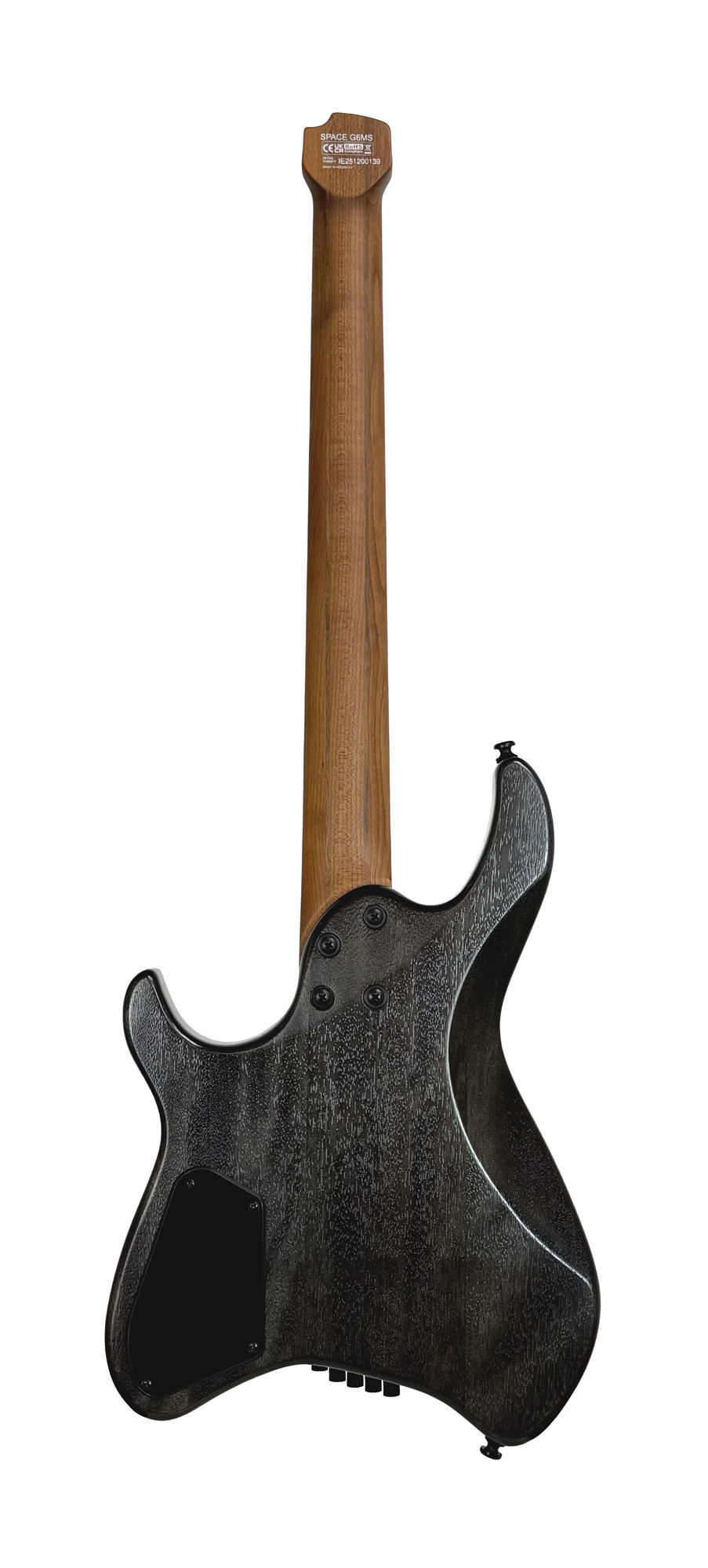 Headless au format original, corps en okoumé, manche multiscale 5 pièces en érable torréfié et noyer, 2 micros doubles Cort Voiced Tone VTH77, finition trans black semi brillante et housse incluse.