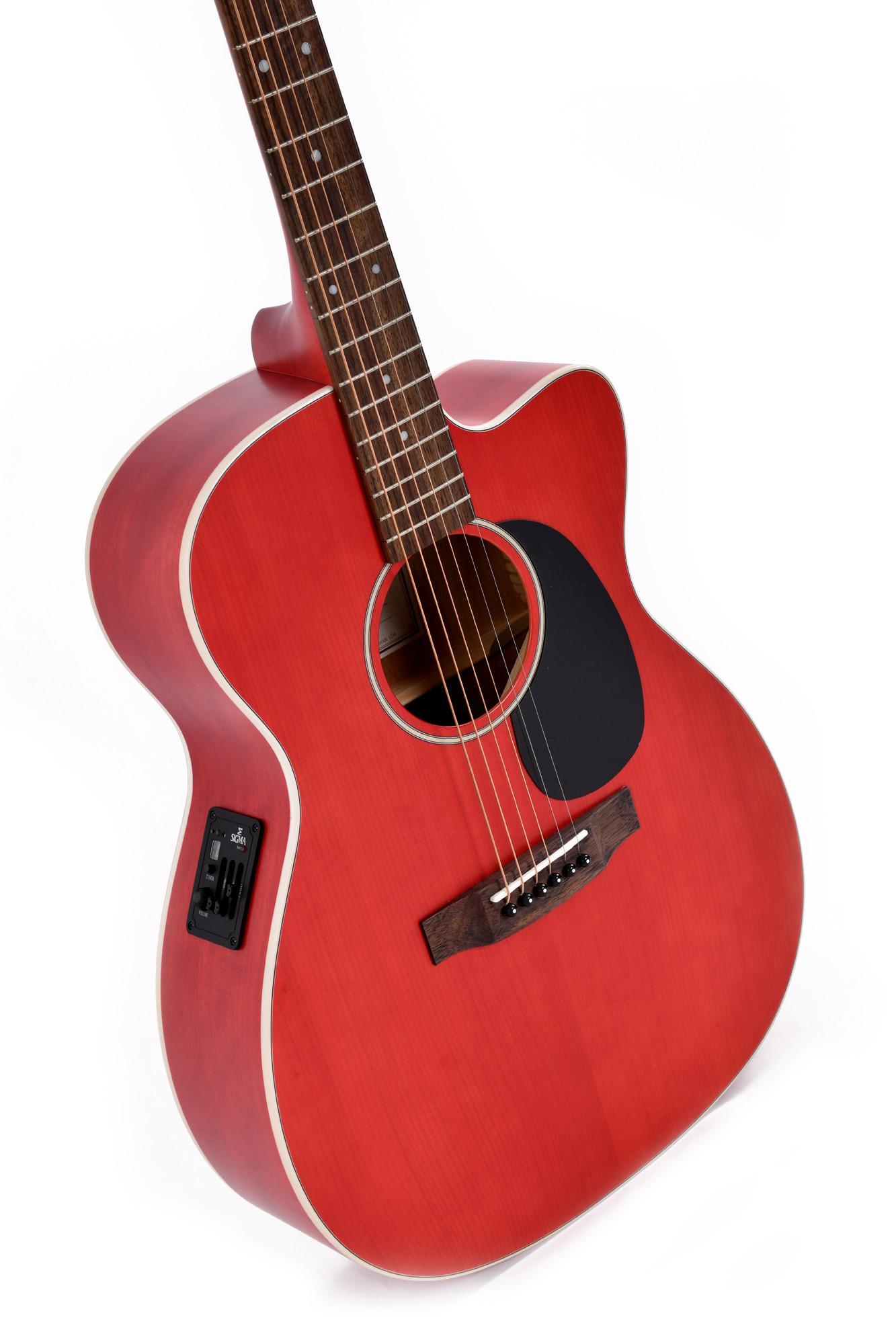 Ce modèle présente une forme 000 pan coupé avec une table en épicéa Sitka, un fond et des éclisses en acajou, ainsi qu’un manche en acajou. Il est équipé d’un EQ Sigma SE-PT et affiche une finition rouge satinée. Le sillet de 43 mm, les sillets en os, la touche en laurier, les mécaniques à bain d’huile chromées et les cordes D'Addario EXP16 complètent l’ensemble.