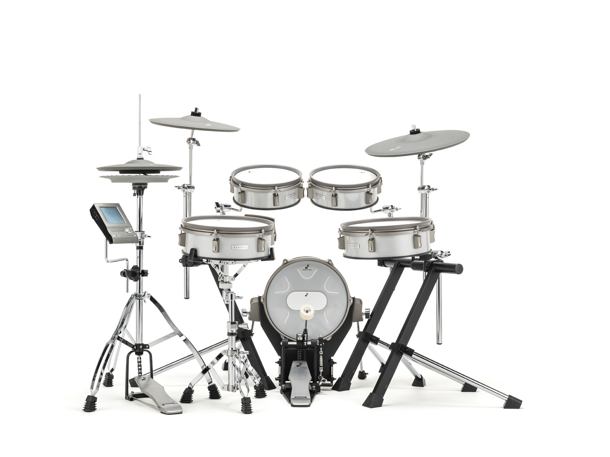 La configuration repose sur des fûts 6 plis en bouleau et comprend un pad de grosse caisse 12", une caisse claire 12"x04" à trois zones de jeu, deux toms 10"x3,5" à deux zones, un tom 12"x04" à deux zones, un charleston 12" à deux zones, une crash 14" à trois zones avec fonction étouffement et une ride 16" à trois zones avec fonction étouffement. Trois trépieds avec supports sont inclus pour l’ensemble des pads de tom et de cymbale, ainsi qu’un pied de caisse claire.