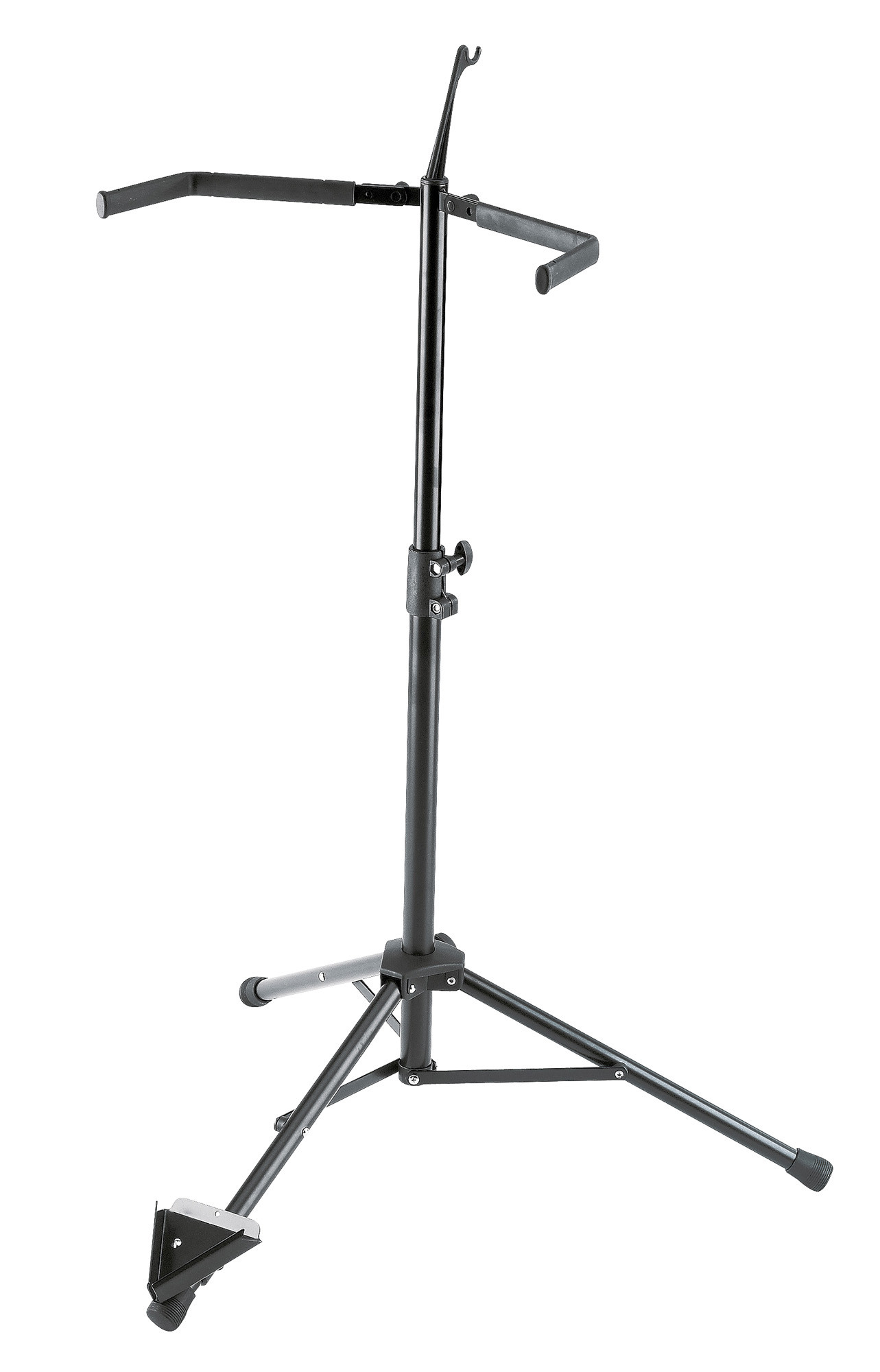 Il offre un étrier ajustable avec revêtement protecteur, ainsi qu’une hauteur réglable de 590 à 1010 mm, ce qui permet un maintien adapté à l’instrument.