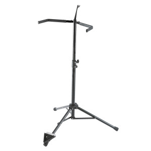 Ce support robuste en acier est conçu pour maintenir l’instrument en toute stabilité. Il convient à tous les modèles et intègre un revêtement en caoutchouc et liège sur les zones de contact afin de mieux préserver l’instrument. Sa largeur est ajustable de 285 à 450 mm, ce qui facilite l’adaptation à différentes tailles. Le crochet pour archet repliable ajoute une fonctionnalité pratique, tandis que sa finition noire lui confère un aspect sobre et discret. Son poids de 2,6 kg contribue à sa bonne stabilité.