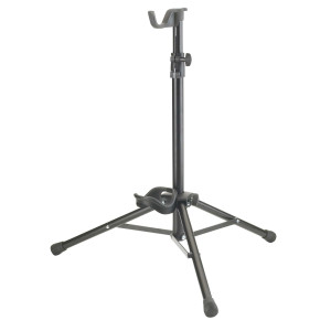 Ce support est conçu pour maintenir un trombone basse de manière stable et sécurisée. Il est équipé d’un cône en bois avec bandes de feutre pour un maintien adapté de l’instrument, ainsi que de pieds pliables pour faciliter le rangement et le transport.
