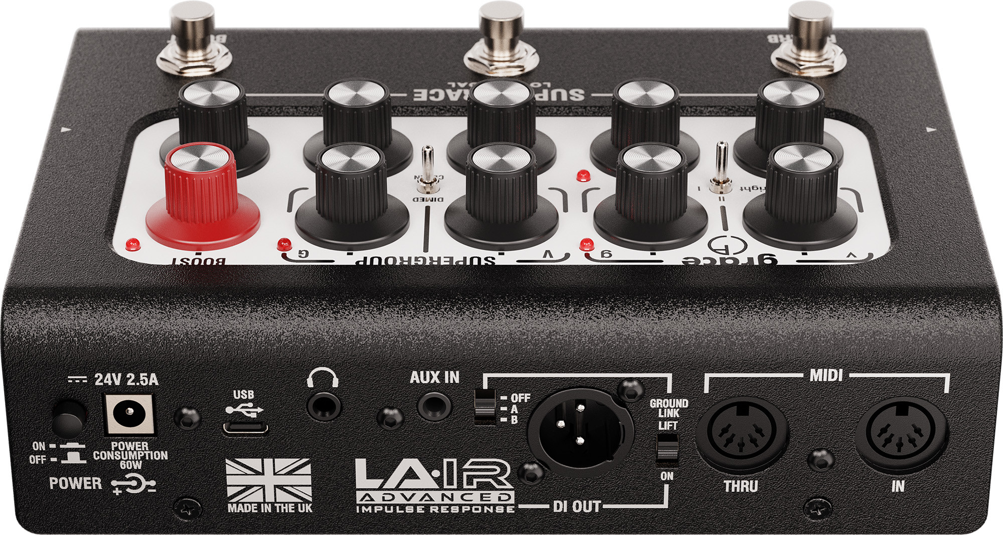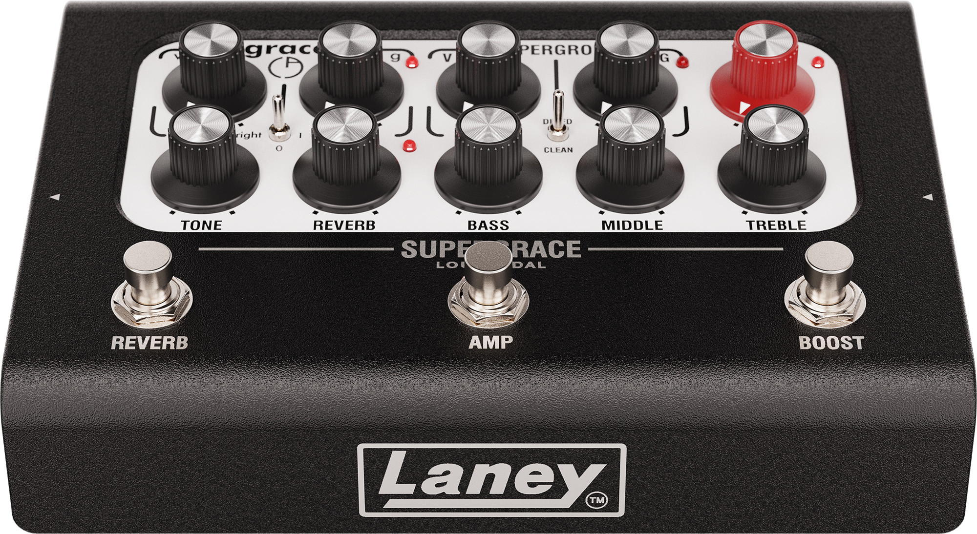 Le canal « SUPERGROUP » est basé sur l’ampli Laney SUPERGROUP LA100BL et propose un switch clean/dimed. Le canal « Grace » s’inspire de l’ampli Carstens Grace et intègre un switch bright. Chaque canal dispose de Gain et Volume, avec un switch de sélection de canal pour passer facilement de l’un à l’autre.