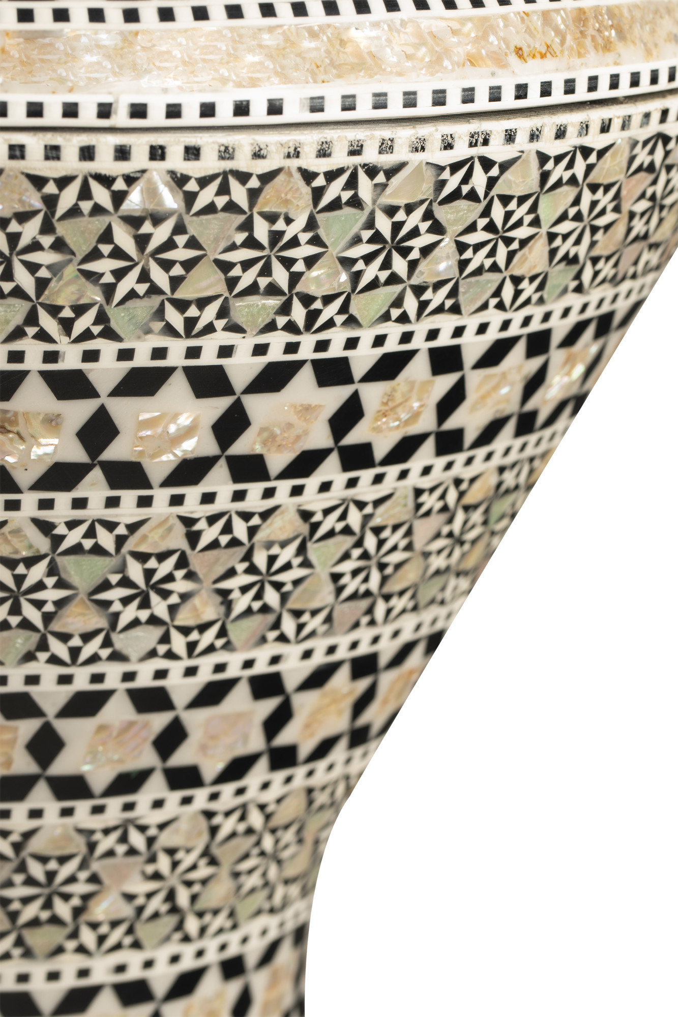 Il combine aluminium, peau synthétique et nacre blanche, avec des mosaïques égyptiennes authentiques et une clé d’accordage incluse pour un usage pratique.