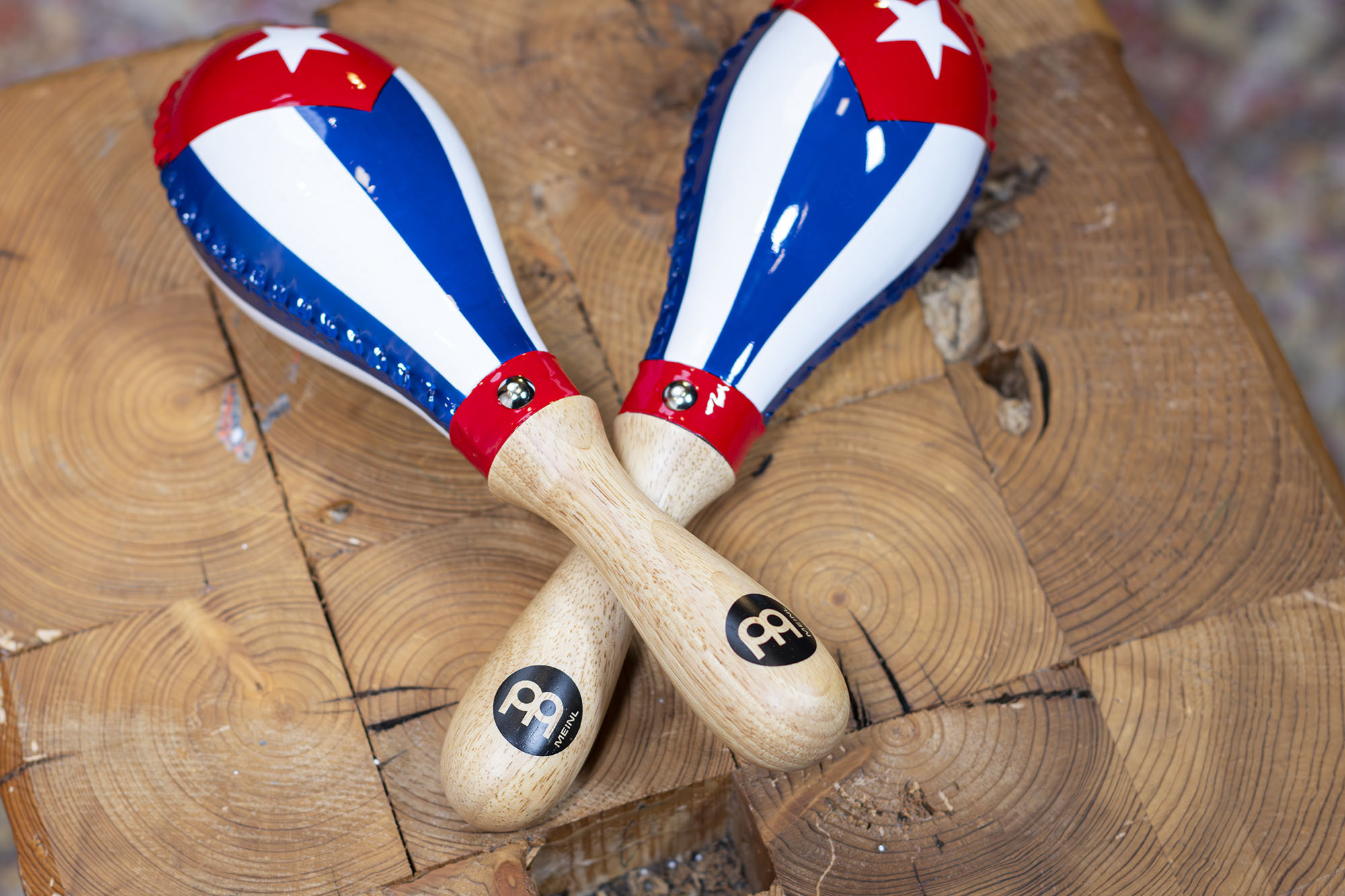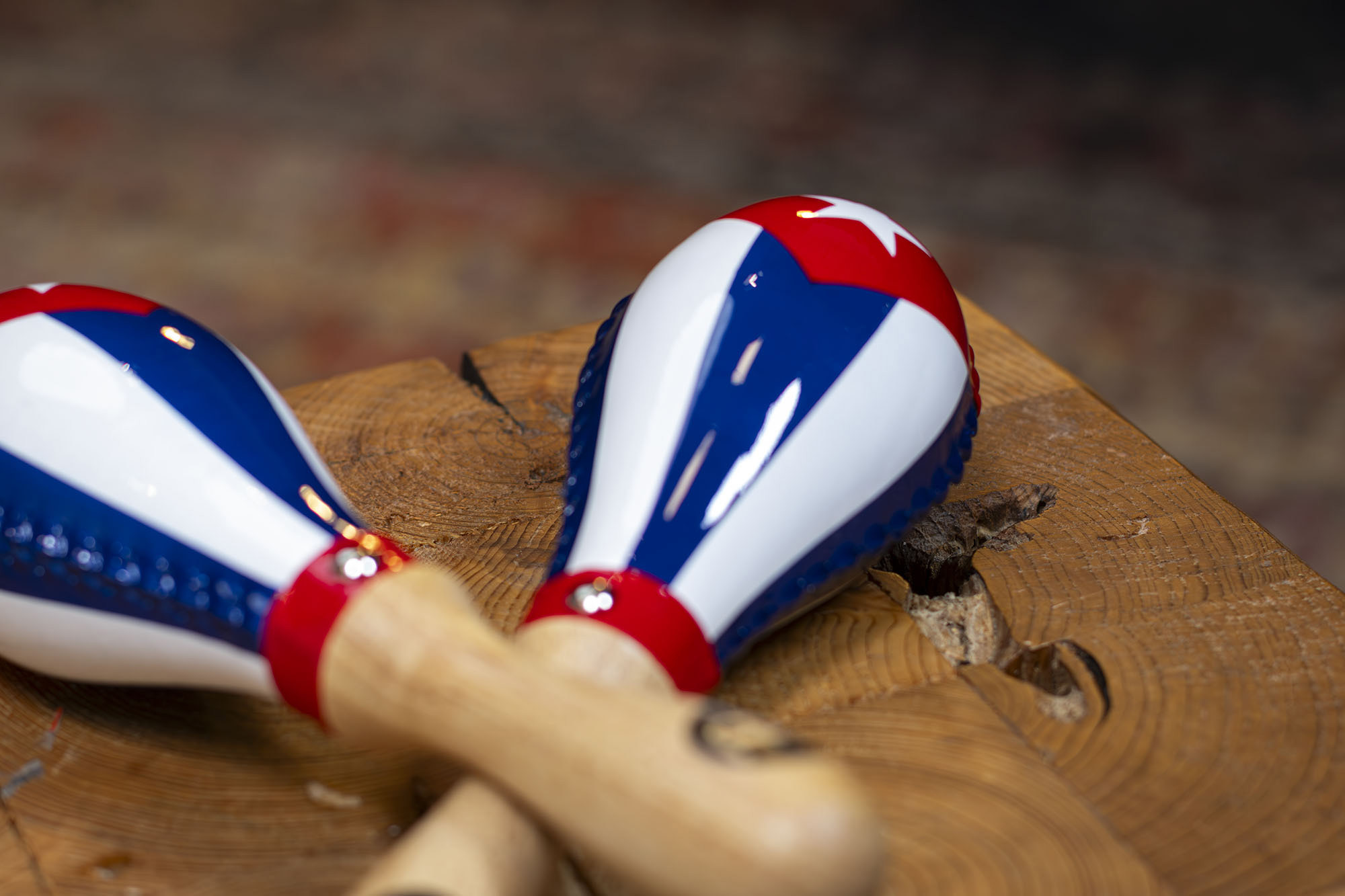 Maracas en cuir, modèle standard avec design drapeau cubain, fabriquées à la main pour offrir un son chaud et une bonne prise en main.