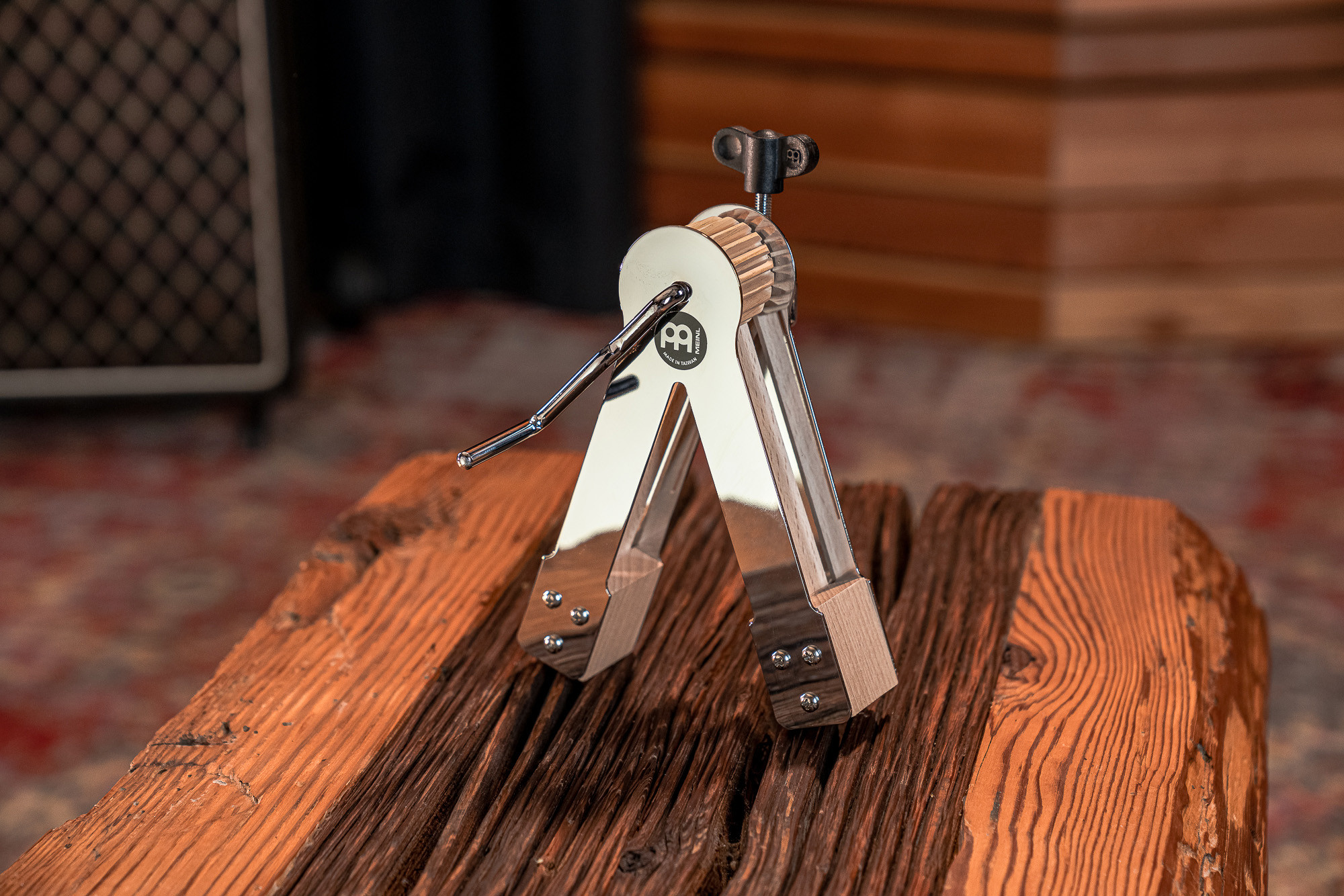 Crécelle d'orchestre Meinl en acier chromé et bois. Montable sur un stand.