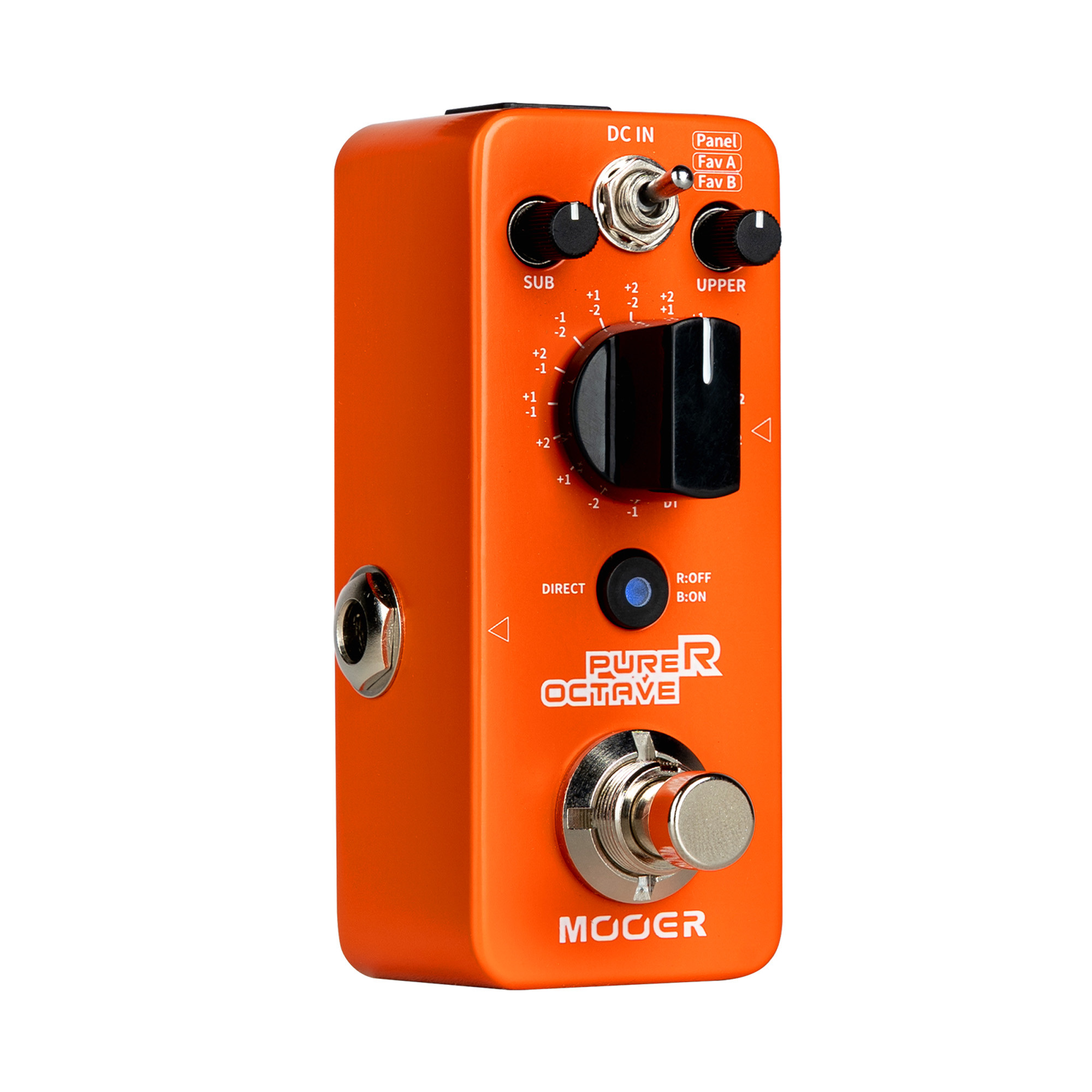 Pédale octaver polyphonique avec 15 modes et 1 mode Detune, conçue dans un boîtier métal avec true bypass et finition orange brillante. Elle propose un commutateur 3 positions pour un fonctionnement en temps réel et 2 presets.