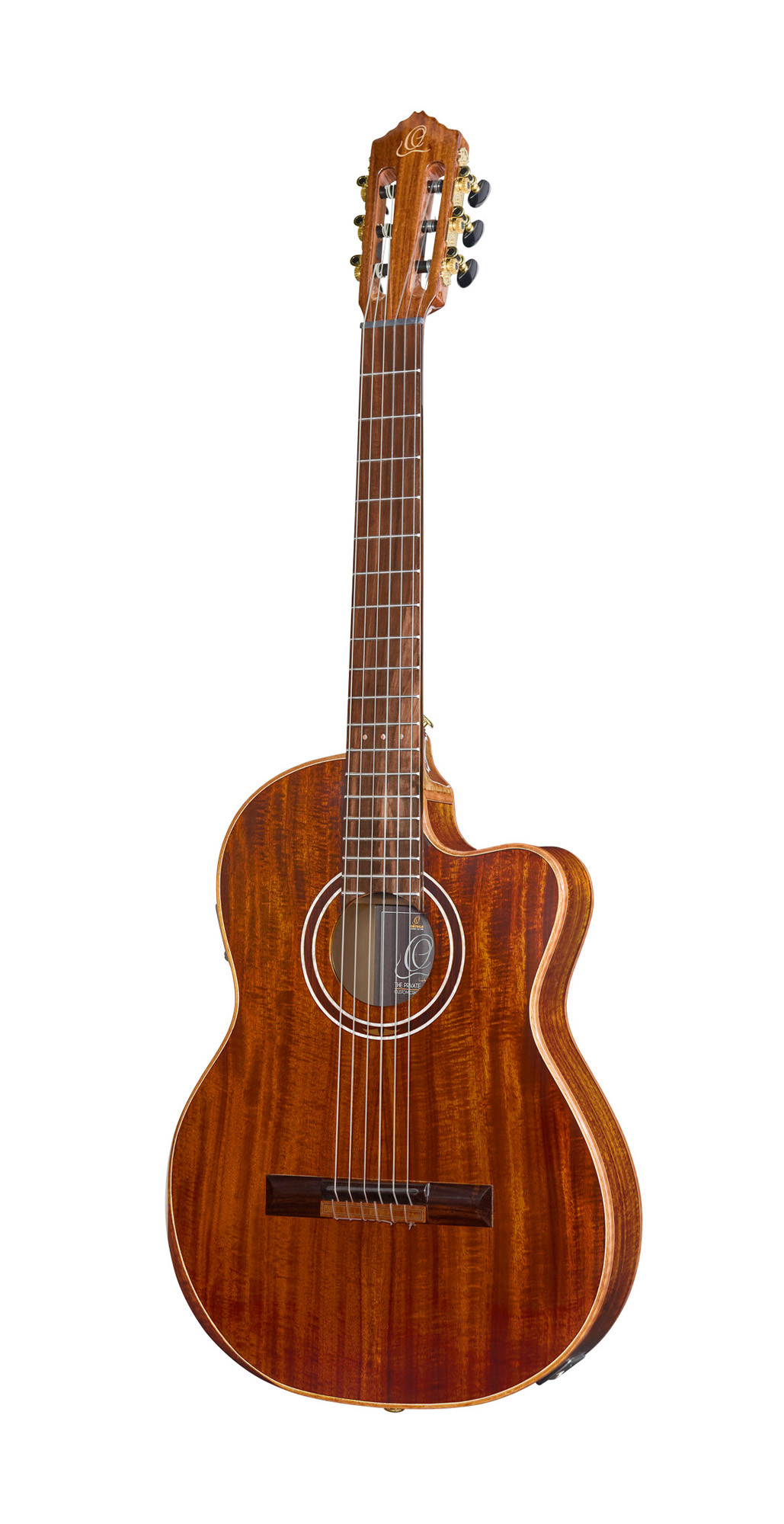 Ce modèle Thinline au pan coupé associe une table en épicéa massif avec placage en acacia flammé, ainsi qu’un fond et des éclisses en acacia flammé pour une finition brillante et soignée. Il est équipé d’un système Ortega MagusPro/G rechargeable, d’un manche en okoumé avec sillet de 50 mm, d’une touche et d’un chevalet en palissandre, ainsi que d’un chevalet 12 trous. Le confort de jeu est renforcé par un armrest, un évent sur l’éclisse et un truss rod à double action. Les mécaniques en laiton/noir satiné classe A, les cordes Ortega NYP44H et la housse deluxe rembourrée complètent l’ensemble.