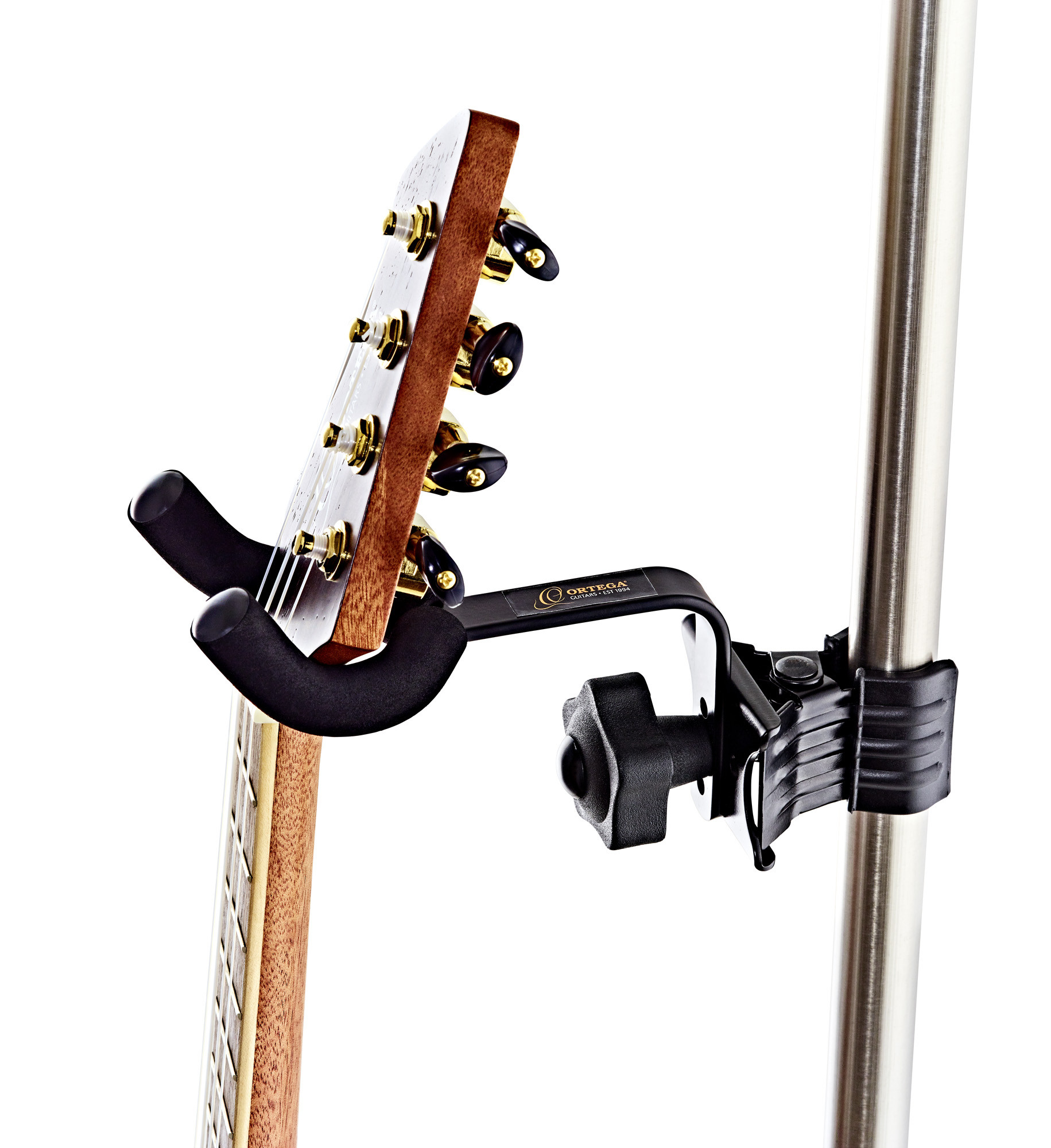 Ce support s’adapte sur un pied de guitare, un pied de micro ou un pupitre, offrant ainsi une solution pratique pour maintenir votre instrument à portée de main. Sa conception simple et efficace facilite l’installation au quotidien.
