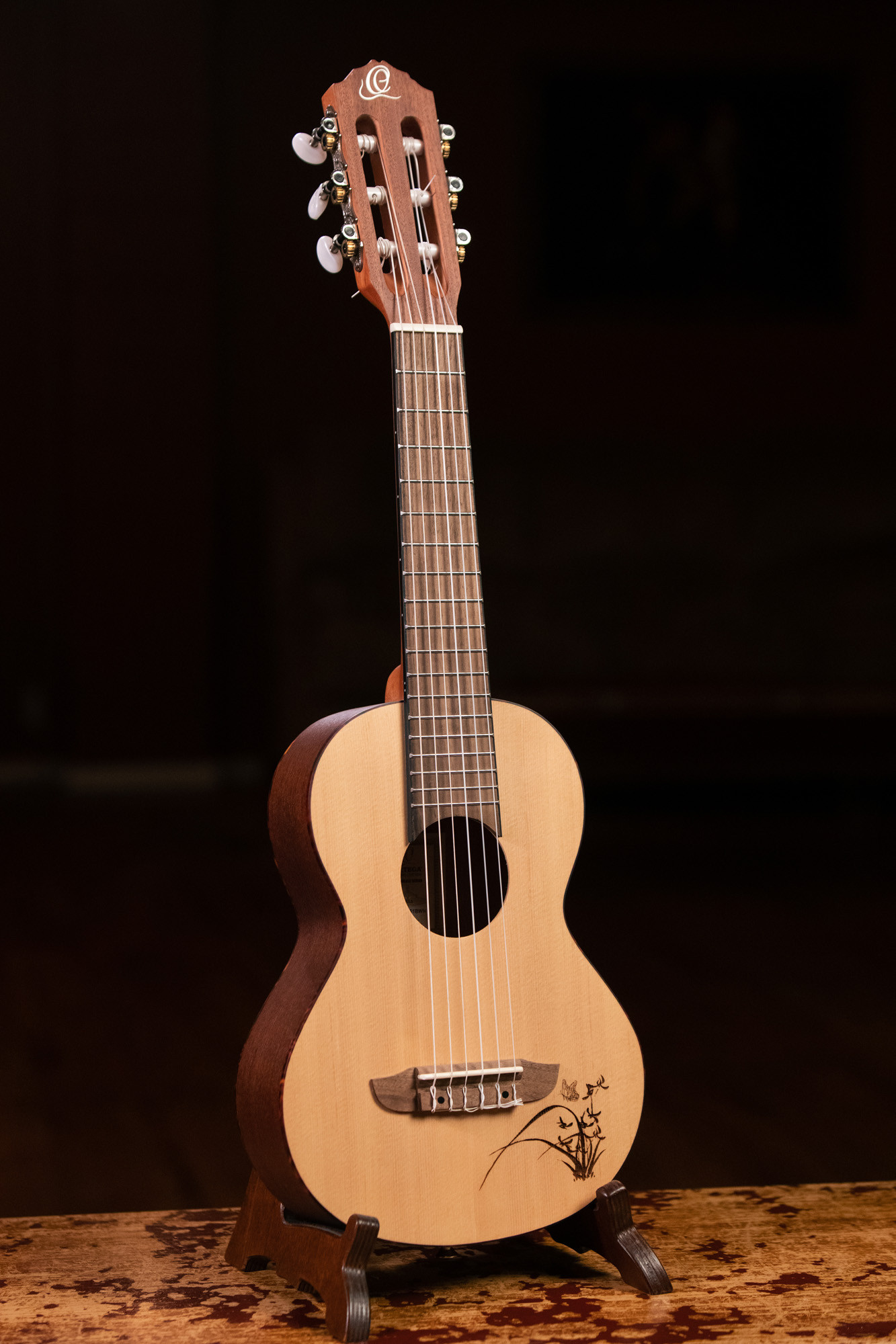Ce modèle dispose de 18 frettes, d’une touche et d’un chevalet en sonokeling, ainsi que de cordes D’Addario. L’accordage indiqué est F#/B/E/A/C#/F#.