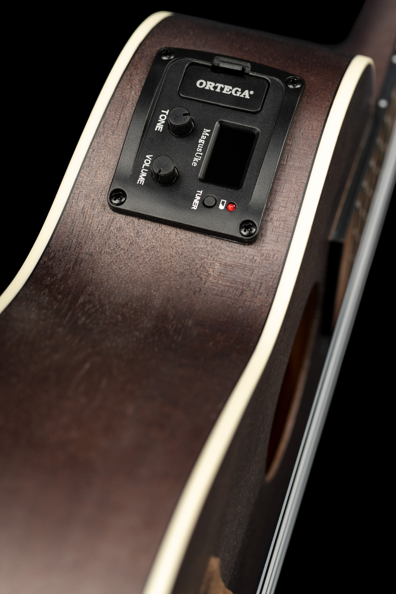 Il se distingue par son format concert pan coupé, son EQ Ortega MagusUke, sa finition noir satiné et son équipement complet comprenant notamment 18 frettes, un sillet de 36 mm et des cordes Ortega.