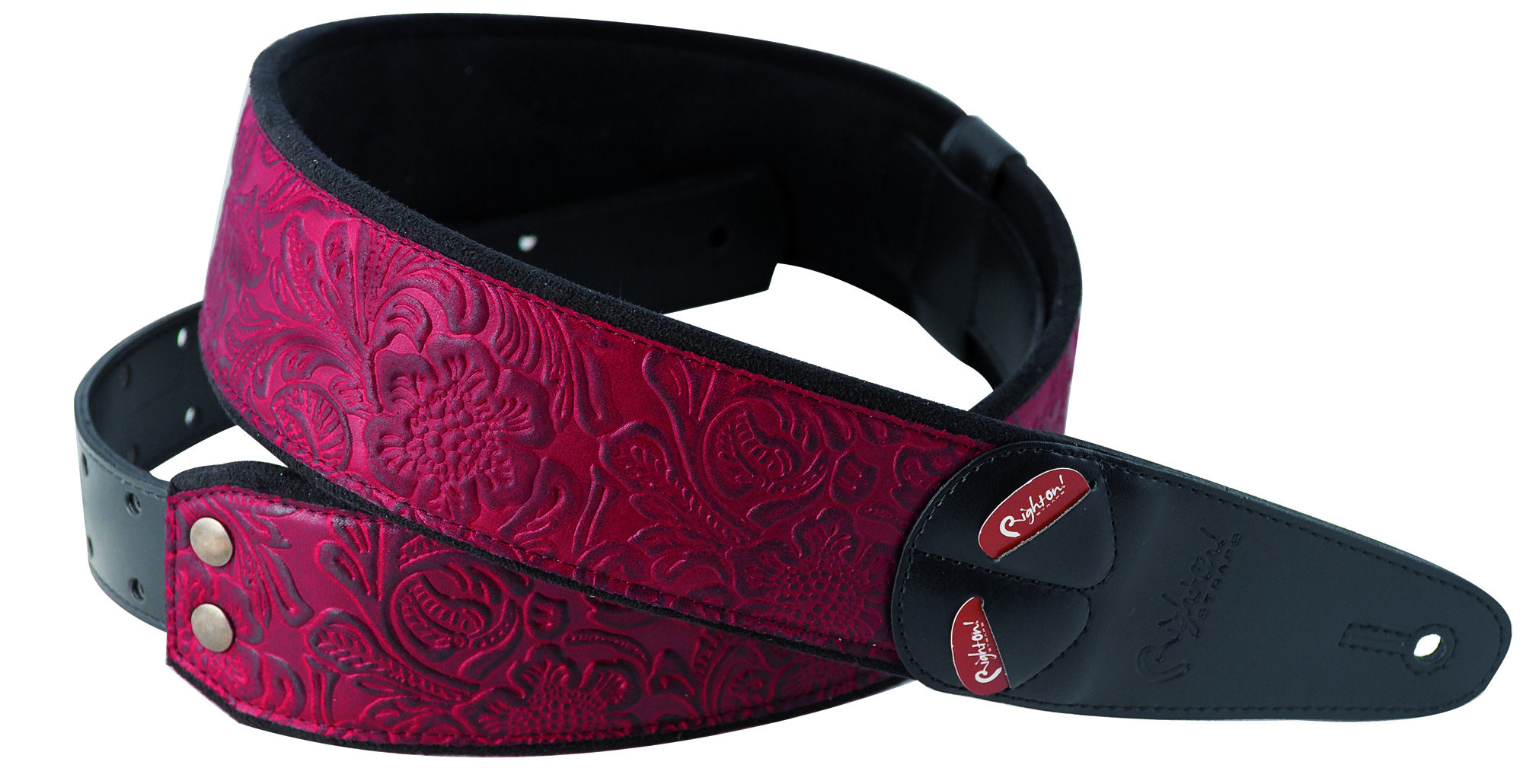 Courroie modèle SANDOKAN, avec extérieur synthétique, largeur de 6 cm et longueur réglable de 100 à 145 cm. Elle intègre un porte-médiators pratique et se présente en coloris rouge.