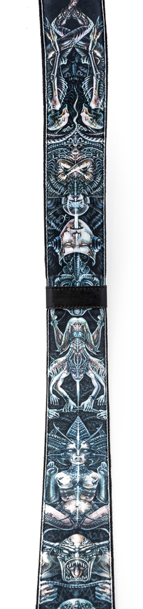 Courroie modèle SEVEN avec extérieur en tissu, largeur de 6 cm et longueur réglable de 100 à 145 cm. Elle intègre un porte-médiators et présente un motif unic « sept péchés ». Sa conception associe une doublure en microfibres, des extrémités 100 % synthétiques et un rembourrage haute densité.