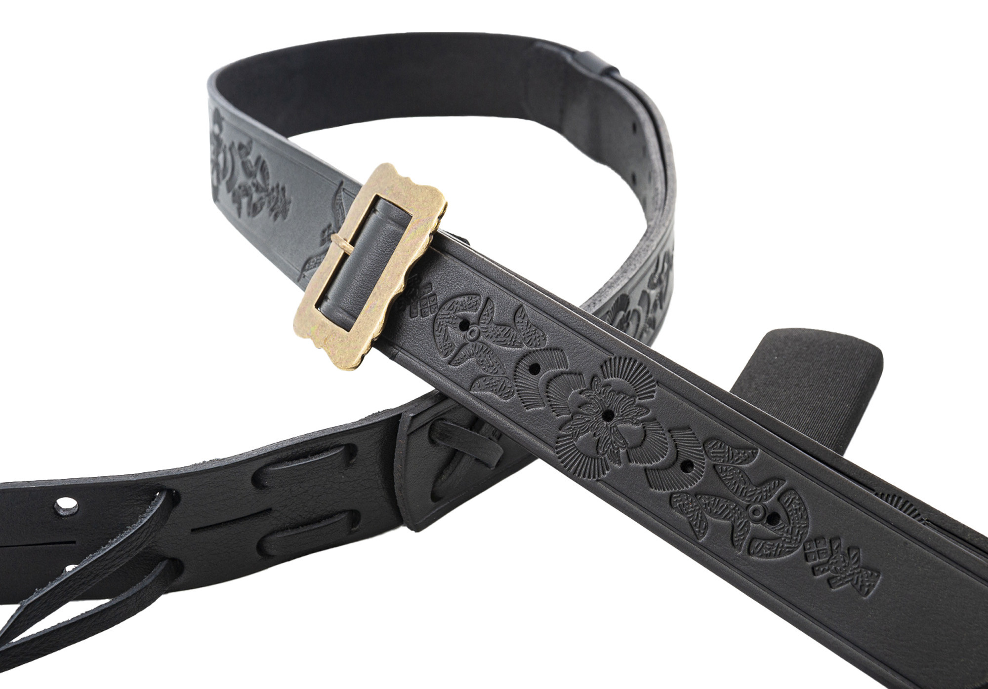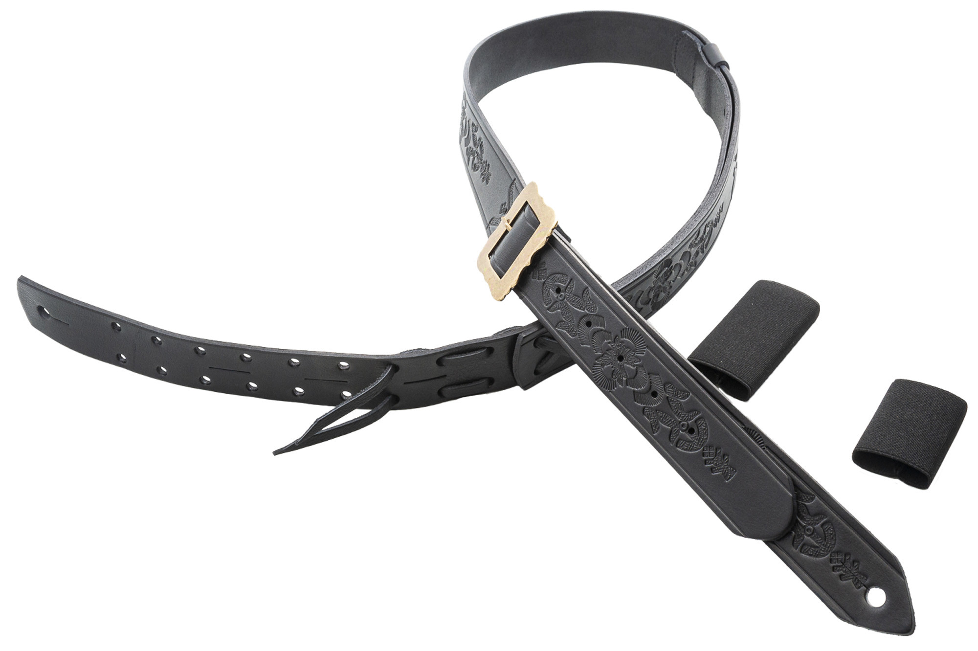 Courroie modèle LEGEND BM BOHEMIAN, conçue en cuir de haute qualité, avec une largeur de 4 cm. Elle offre un port confortable et un style sobre grâce à sa finition noire. Son porte bottleneck intégré ajoute une fonctionnalité pratique pour les musiciens qui souhaitent garder un accessoire à portée de main.