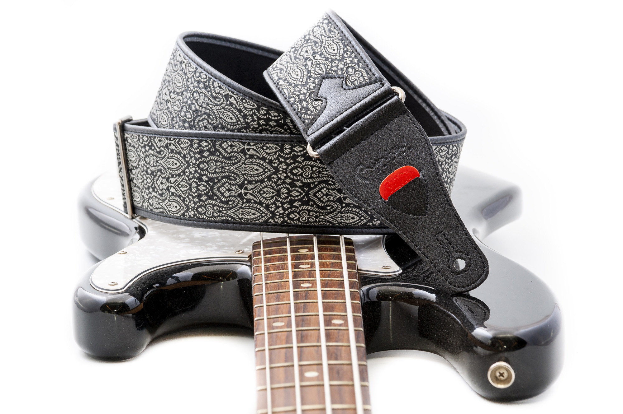 Elle convient aux musiciens qui recherchent une courroie réglable, confortable et fonctionnelle, avec un porte-médiators intégré pour garder leurs accessoires à portée de main.