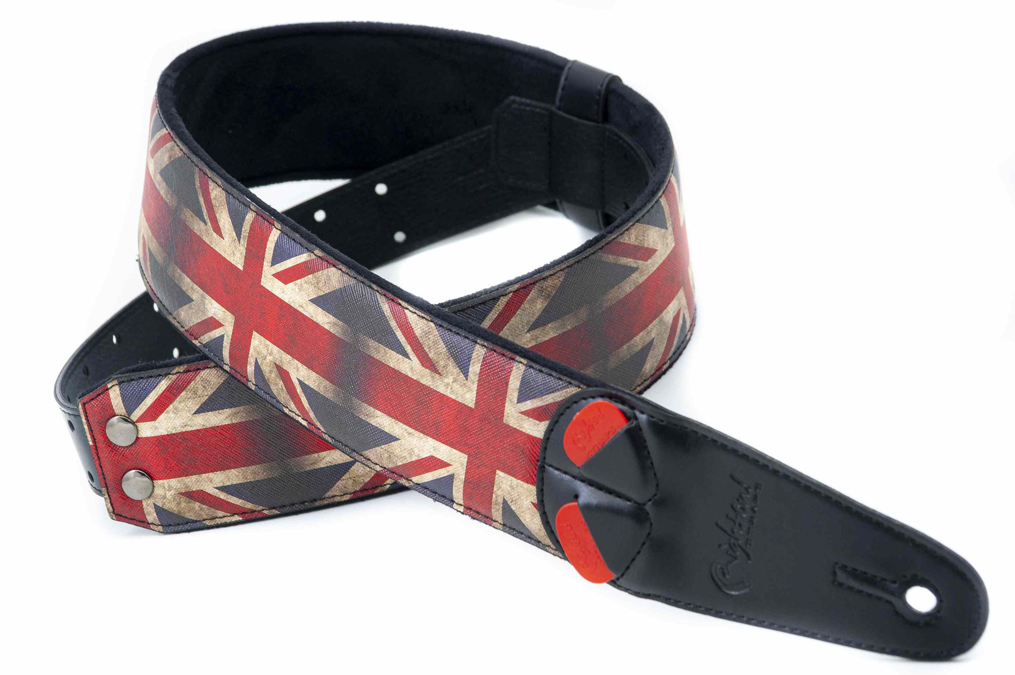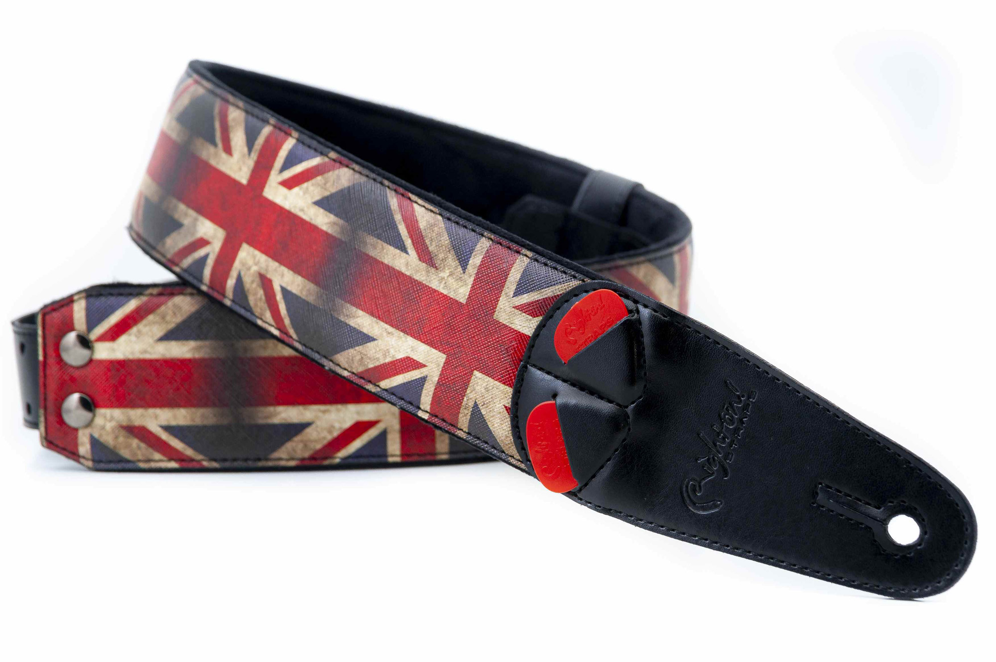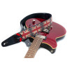Cette courroie modèle UNION JACK est conçue avec un extérieur synthétique et une largeur de 6 cm pour offrir un port confortable. Sa longueur réglable de 100 à 150 cm permet une adaptation à différentes morphologies et préférences de jeu. Elle intègre également un porte-médiators pratique, et sa finition noire lui donne un style sobre et polyvalent.