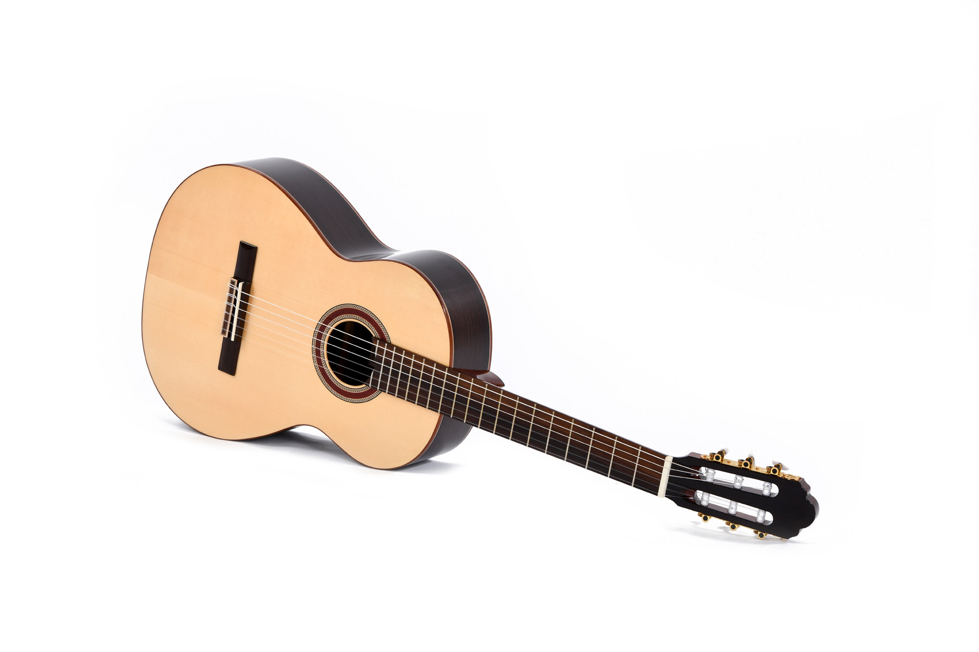 Modèle CR-10, classique 4/4, table cèdre massif, fond & éclisses palissandre indien, manche acajou, sillet en os, touche & chevalet palissandre indien, diapason 650 mm, largeur au sillet 52 mm, mécaniques luxe dorées.