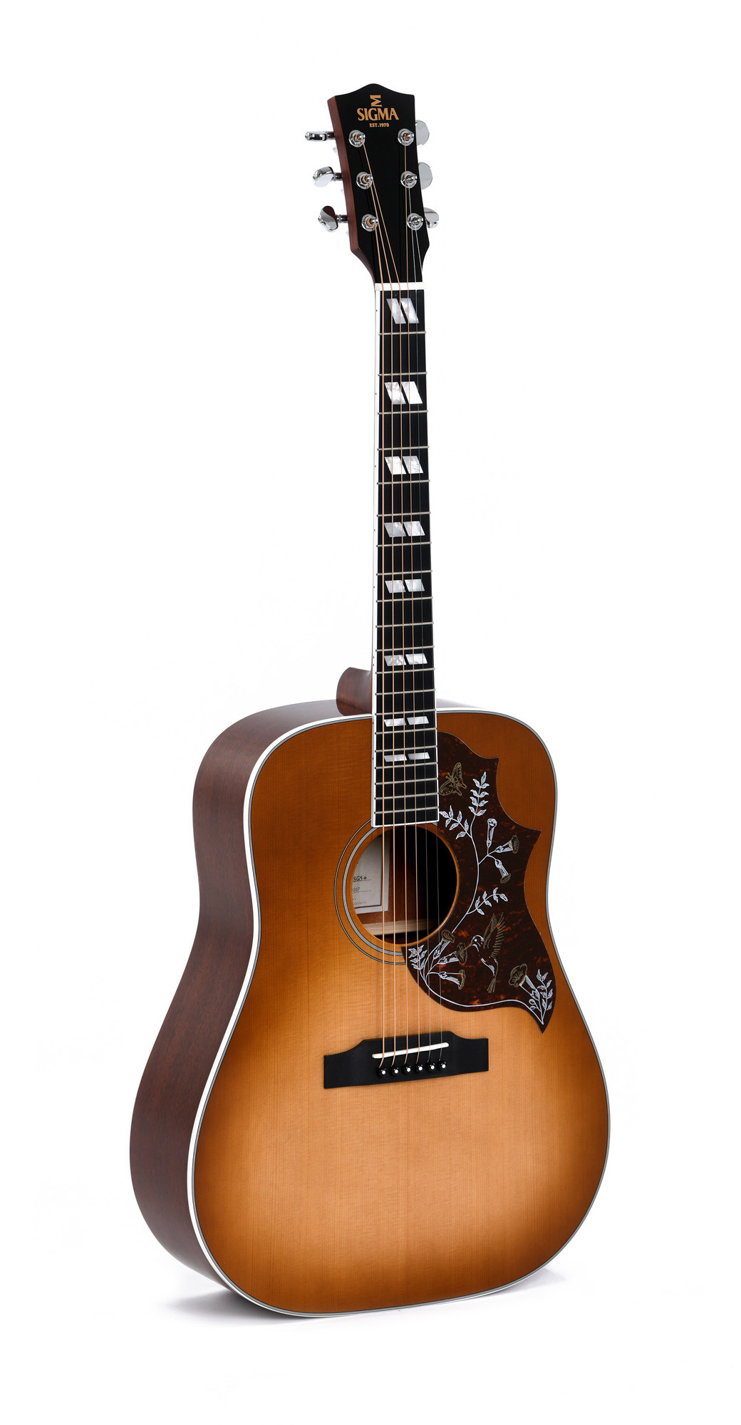 La DM-SG5 est un modèle Dreadnought conçu avec une table en épicéa Sitka massif et un fond ainsi que des éclisses en acajou. Son manche en acajou avec incrustations, sa touche en micarta avec incrustations et ses sillets en os contribuent à une conception soignée et fiable. Elle dispose d’un diapason de 25,4" (645 mm), d’une largeur au sillet de 44,5 mm, de mécaniques à bain d’huile Grover chromées et d’un système EQ Fishman Sonitone. Le tout est livré avec un soft case SSC-D, dans une finition heritage sunburst.