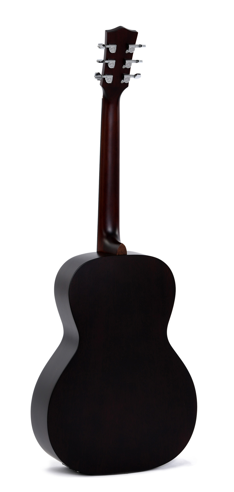 Modèle LM-SGE, Forme 00, table épicéa Sitka massif, fond & éclisses acajou, manche acajou, sillet & chevalet en os, touche micarta, diapason 24.75" (628 mm), largeur au sillet 42.9 mm, mécaniques bain d'huile chromées, EQ Sigma SE-PT (accordeur intégré), finition sunburst satiné.