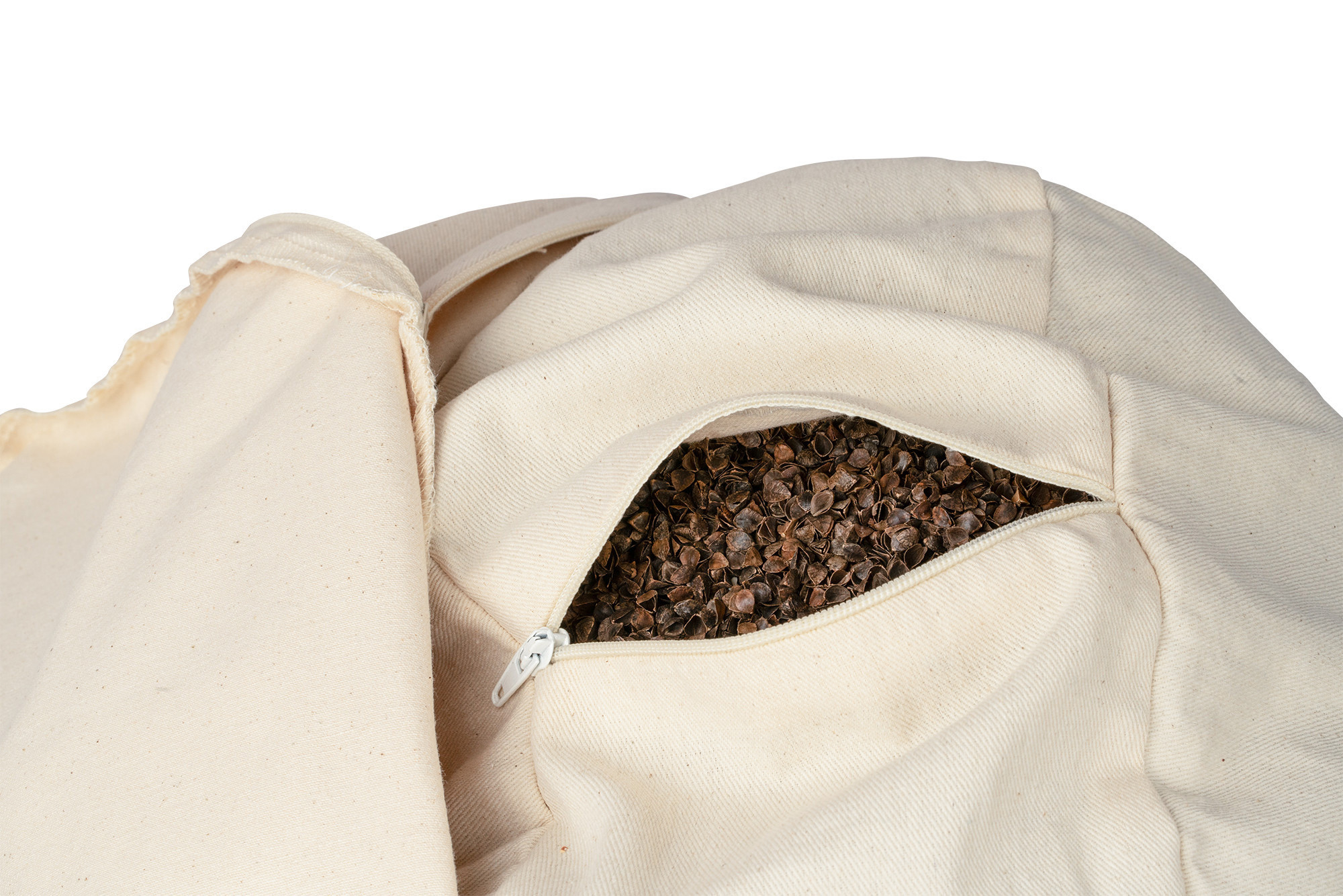 Il offre une housse en coton amovible et lavable, un rembourrage en cosses de sarrasin et un format pensé pour une bonne stabilité.