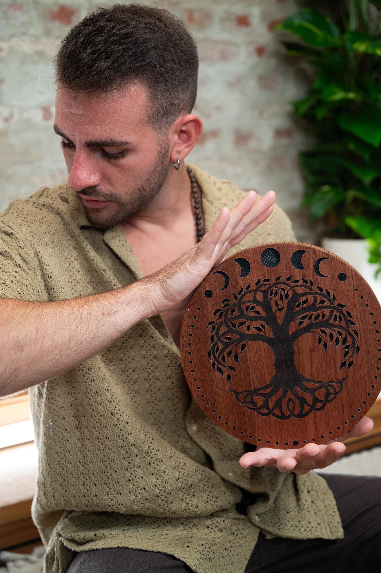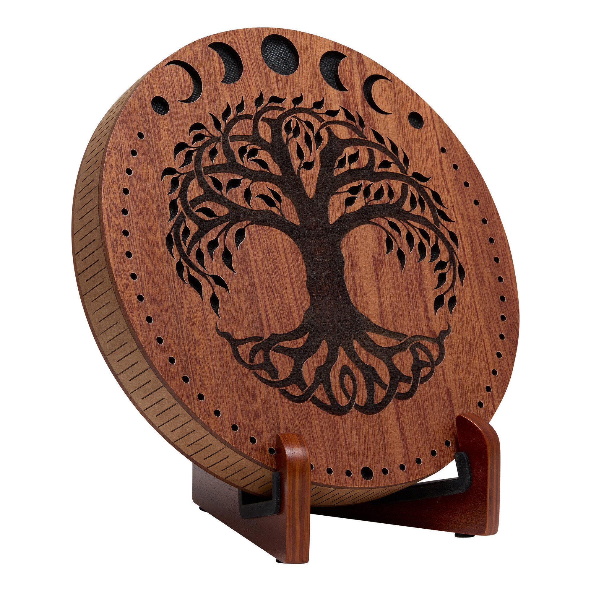 Ce disque de 10" est conçu en bois de Sapelli et présente une surface sculptée avec des motifs de phases lunaires et d’arbre de vie. Avec son diamètre de 25,4 cm et sa hauteur de 3,4 cm, il produit des sons apaisants semblables à ceux d’un ruisseau. Il est livré avec un sac souple et un support en bois pour un rangement et une présentation pratiques.