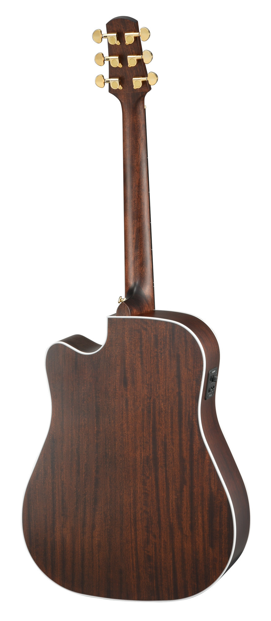 Format Dreadnought pan coupé, table en épicéa massif, fond et éclisses en palissandre, avec système électro-acoustique Fishman Presys II et finition naturel satiné.