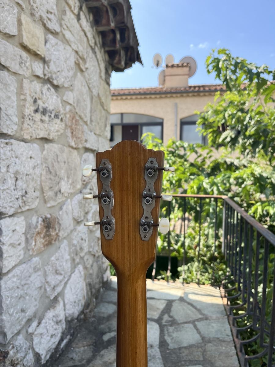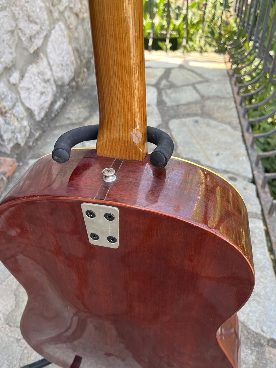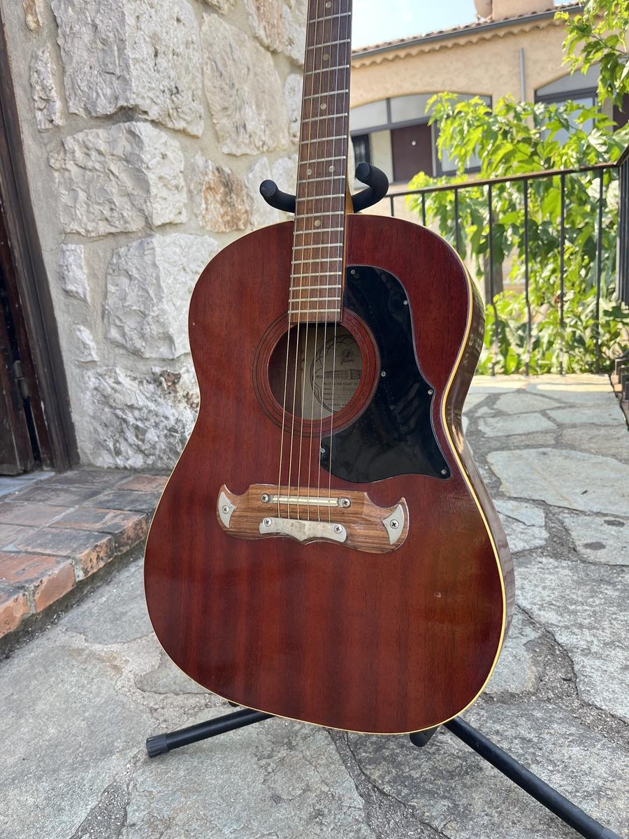 This 6-string acoustic guitar reflects the excellence of German lutherie from the 1960s, featuring a mahogany body with a curved back that enhances its warm and deep sound. The rounded shoulder shape contributes to optimal playing comfort, particularly appreciated by modern guitarists. Its bolt-on neck ensures increased robustness and stability, ideal for musicians seeking a reliable guitar for live performances and studio recordings.