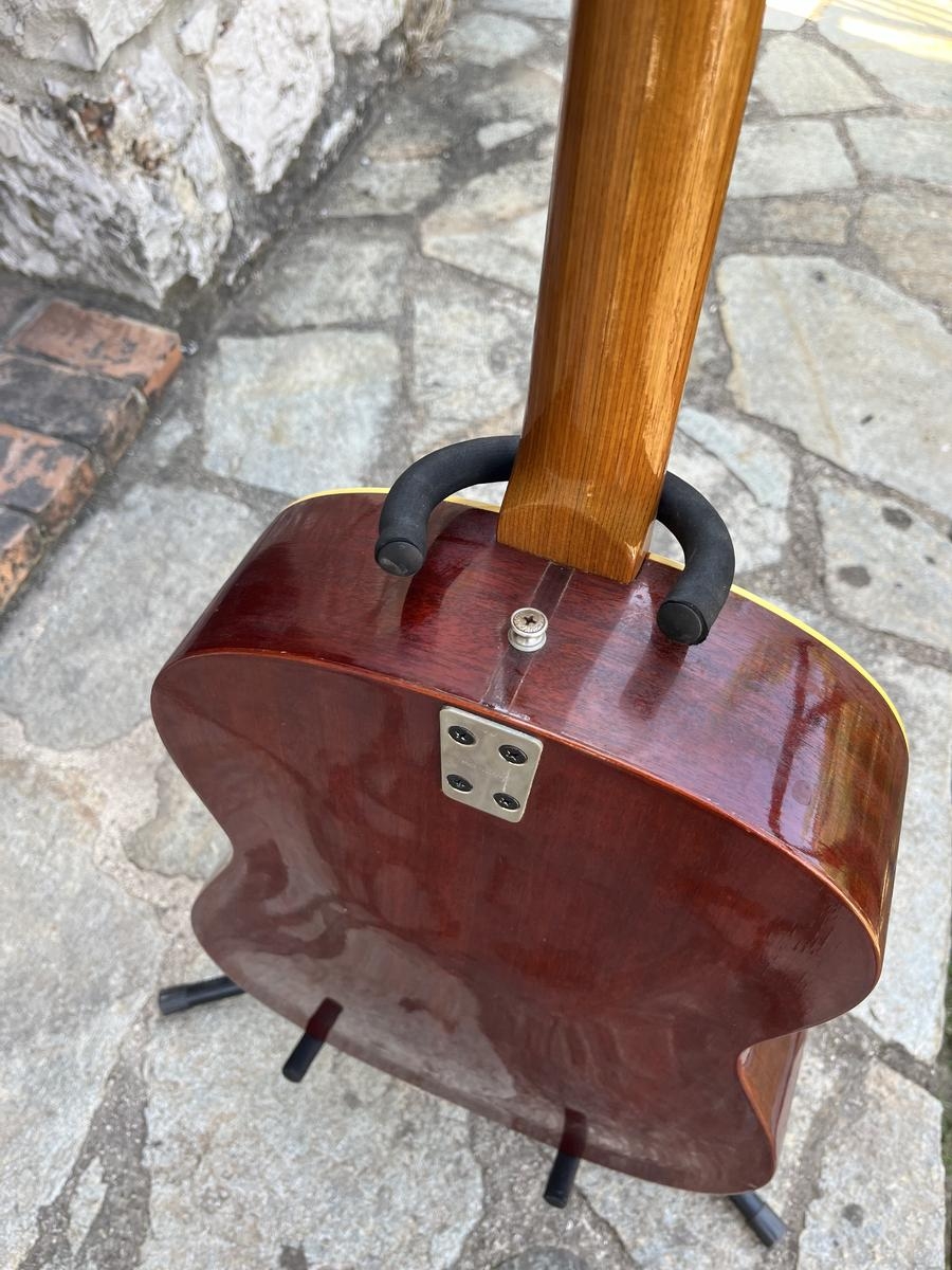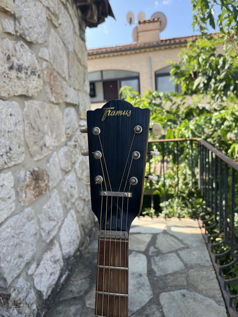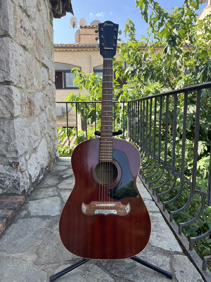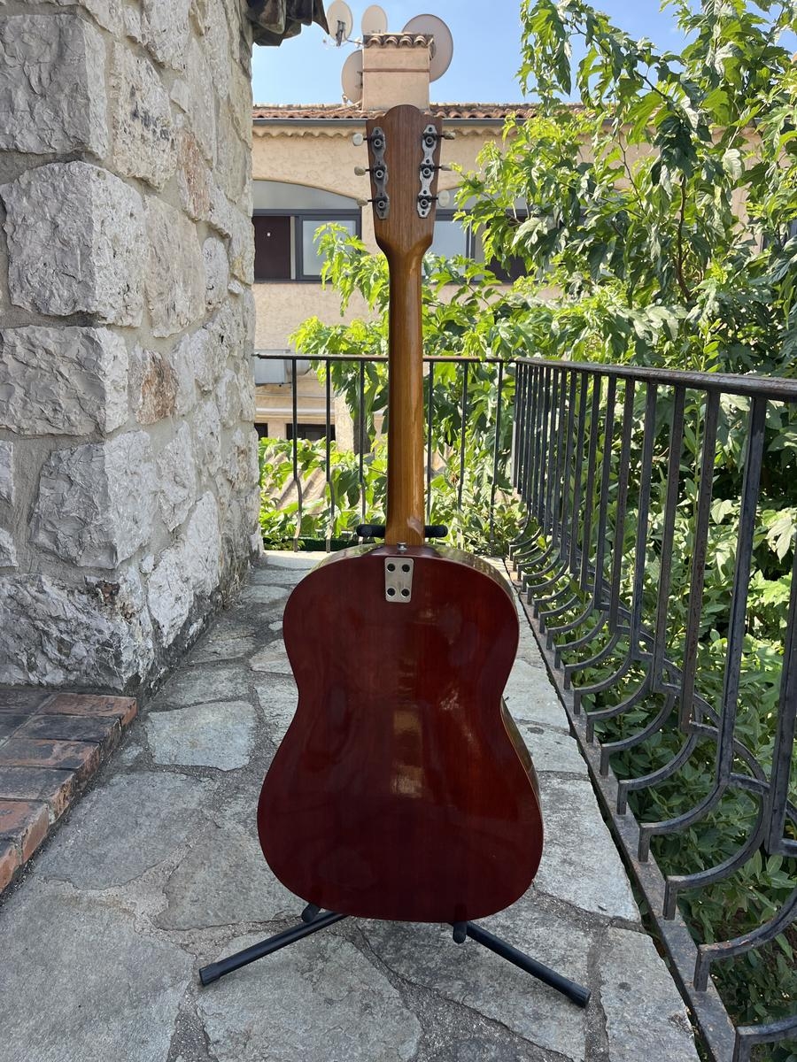 This 6-string acoustic guitar reflects the excellence of German lutherie from the 1960s, featuring a mahogany body with a curved back that enhances its warm and deep sound. The rounded shoulder shape contributes to optimal playing comfort, particularly appreciated by modern guitarists. Its bolt-on neck ensures increased robustness and stability, ideal for musicians seeking a reliable guitar for live performances and studio recordings.