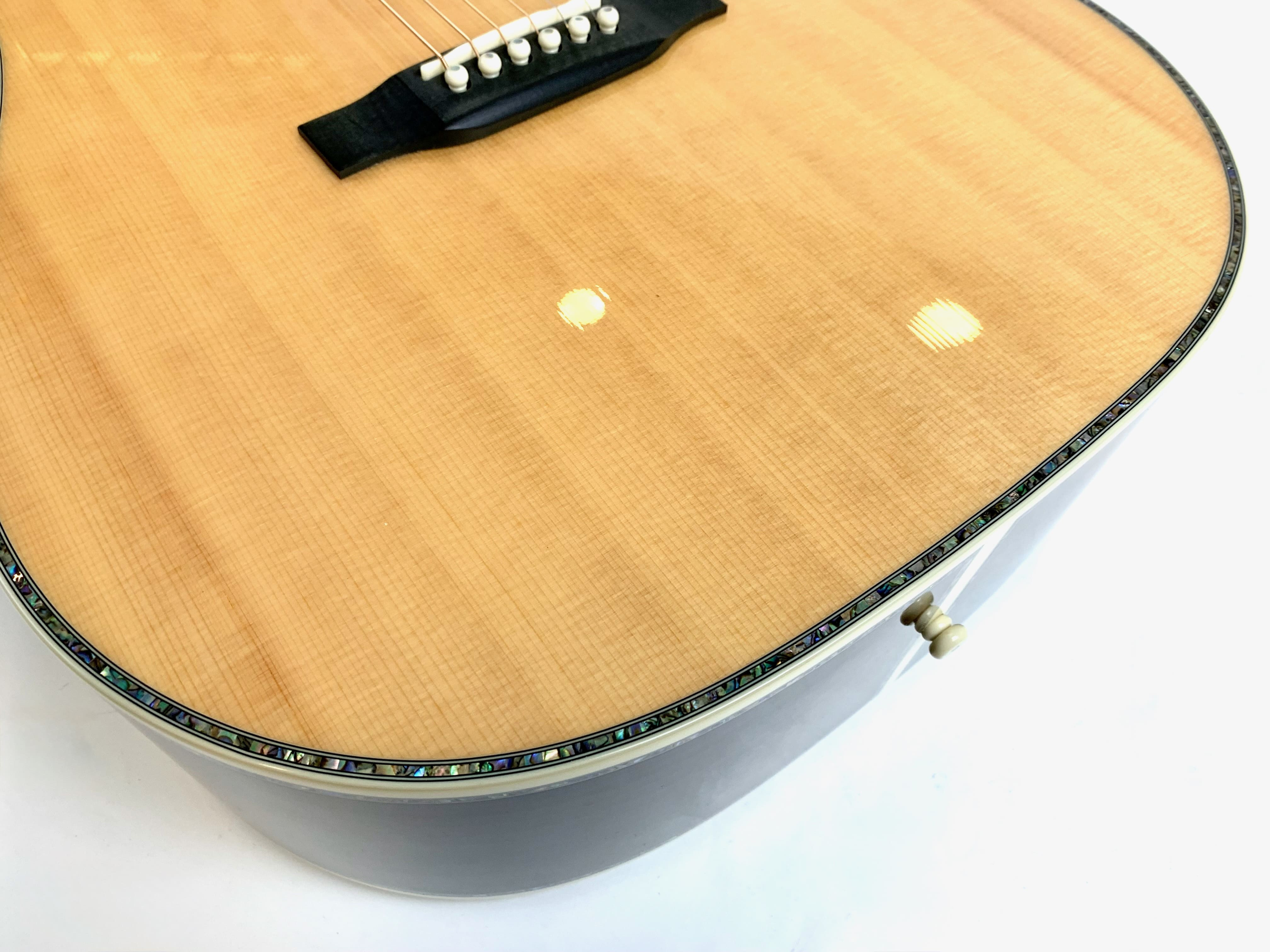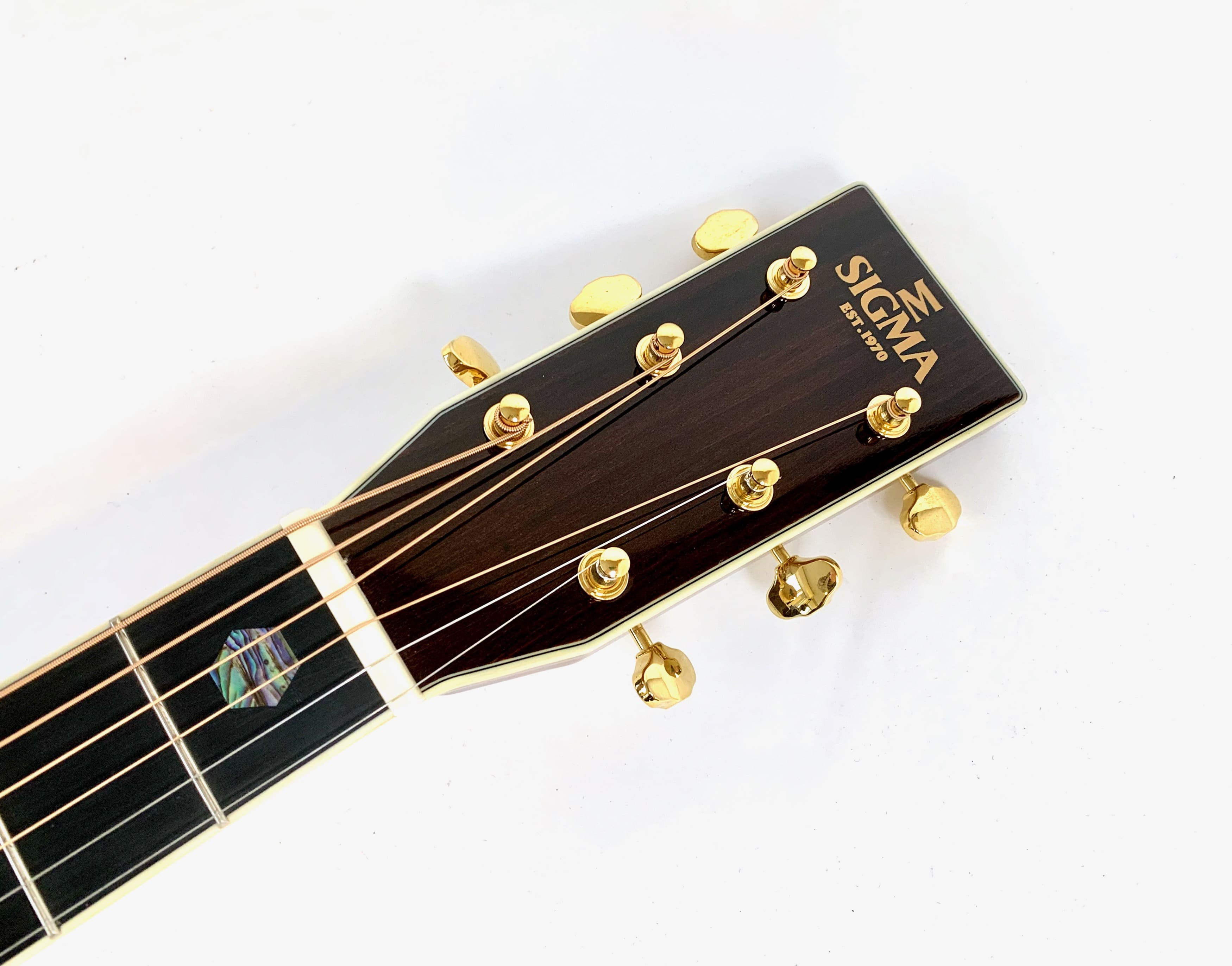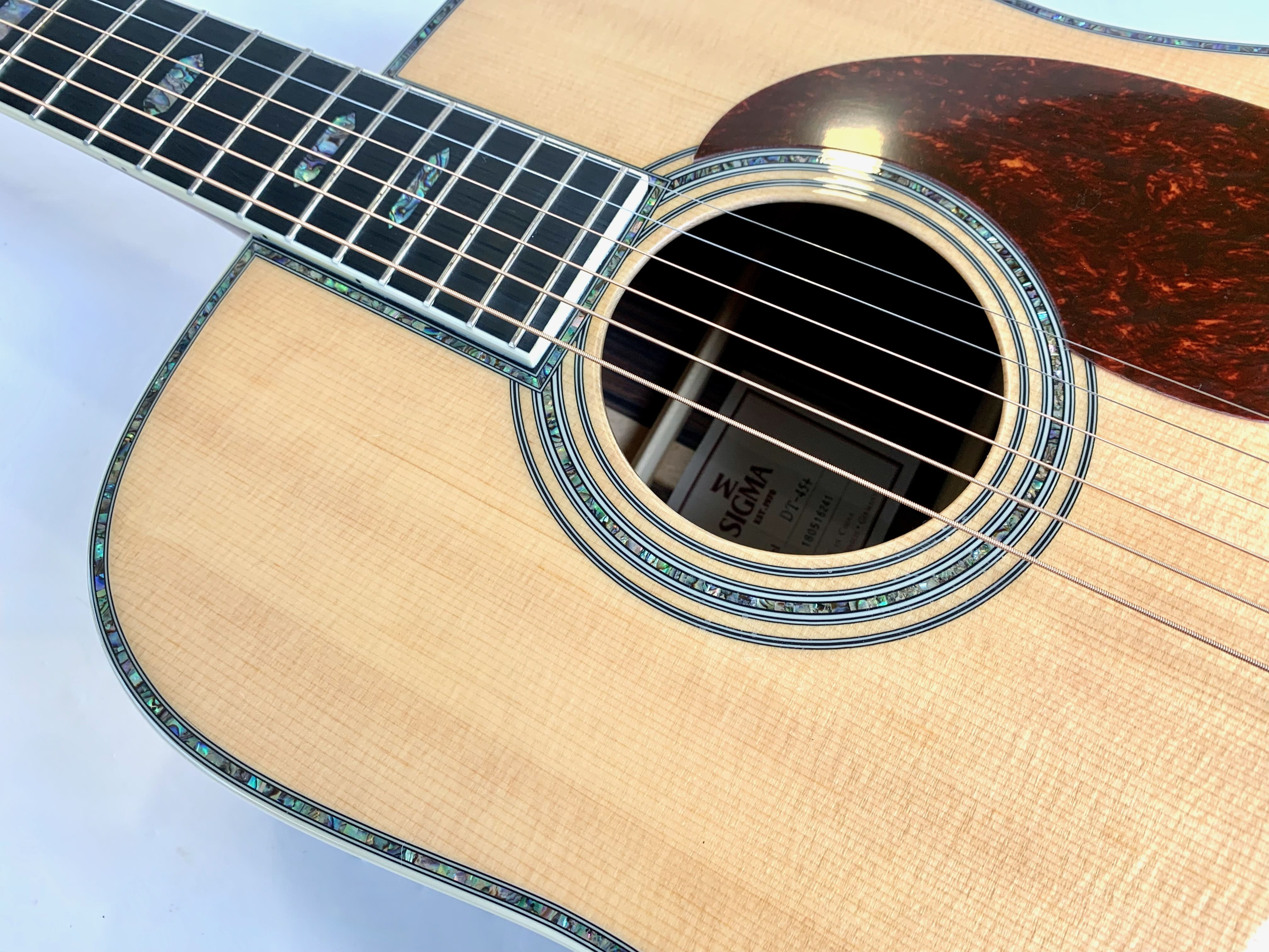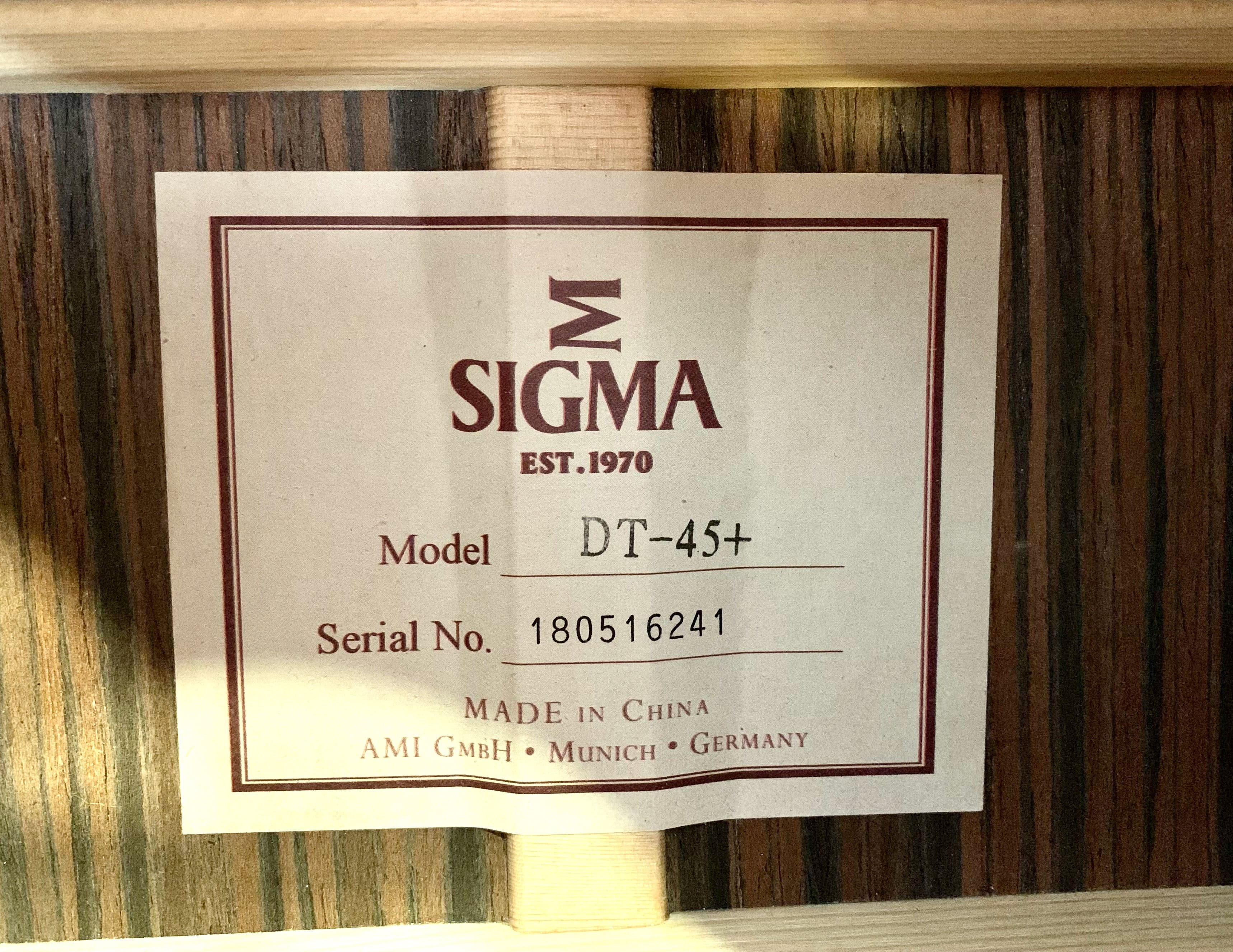 The D-45 sits at the very top of the dreadnought range: at Martin, the higher the number, the more elaborately appointed the guitar. Abalone purfling around the top and rosette, fingerboard inlays, and more. Here is a much more affordable version, offered by Sigma. In terms of construction, it features a Sitka spruce top, basswood back and sides, a mahogany neck, and Micarta fingerboard and bridge. In very good condition.