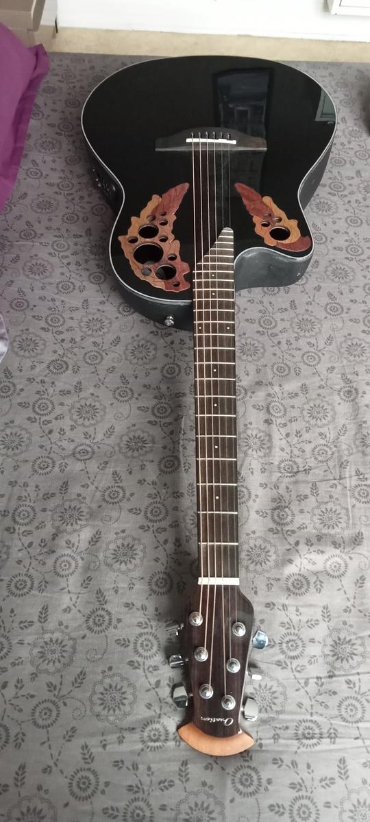 OVATION left-handed electro-acoustic guitar with matching brand case, barely used.