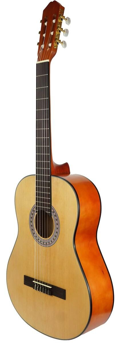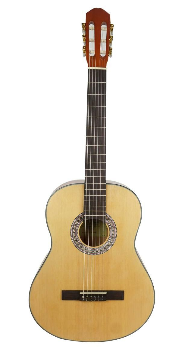 This natural color, satin-finished 3/4 classical guitar is designed to provide optimal comfort for young guitarists or people with small hands. Its 3/4-size body allows for easy handling, perfect for beginners or casual use. The combination of quality materials such as cedar for the top, stained lime for the back and sides, and rosewood for the fingerboard and bridge, ensures a warm and balanced sound. The golden tuners with mother-of-pearl buttons add a refined aesthetic touch, while the satin finish highlights the guitar's natural beauty.