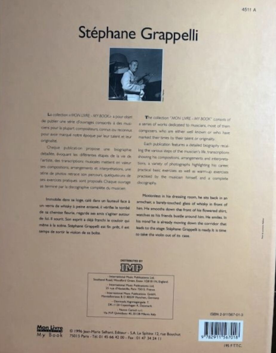 Stephane Grappelli: my book collection My Book - 1996 by Jean-Marie Salhani (Author)Publisher ‏ : ‎ International Music Publications Publication date ‏ : ‎ 31 December 1996 Language ‏ : ‎ French and English ISBN-10 ‏ : ‎ 2911567013 ISBN-13 ‏ : ‎ 978-2911567018 Musical transcriptions showcase his compositions, arrangements, and interpretations, a series of photographs trace his journey, and a few of his practical exercises are provided. Each book concludes with the complete discography of the musician in good overall condition, without annotations.