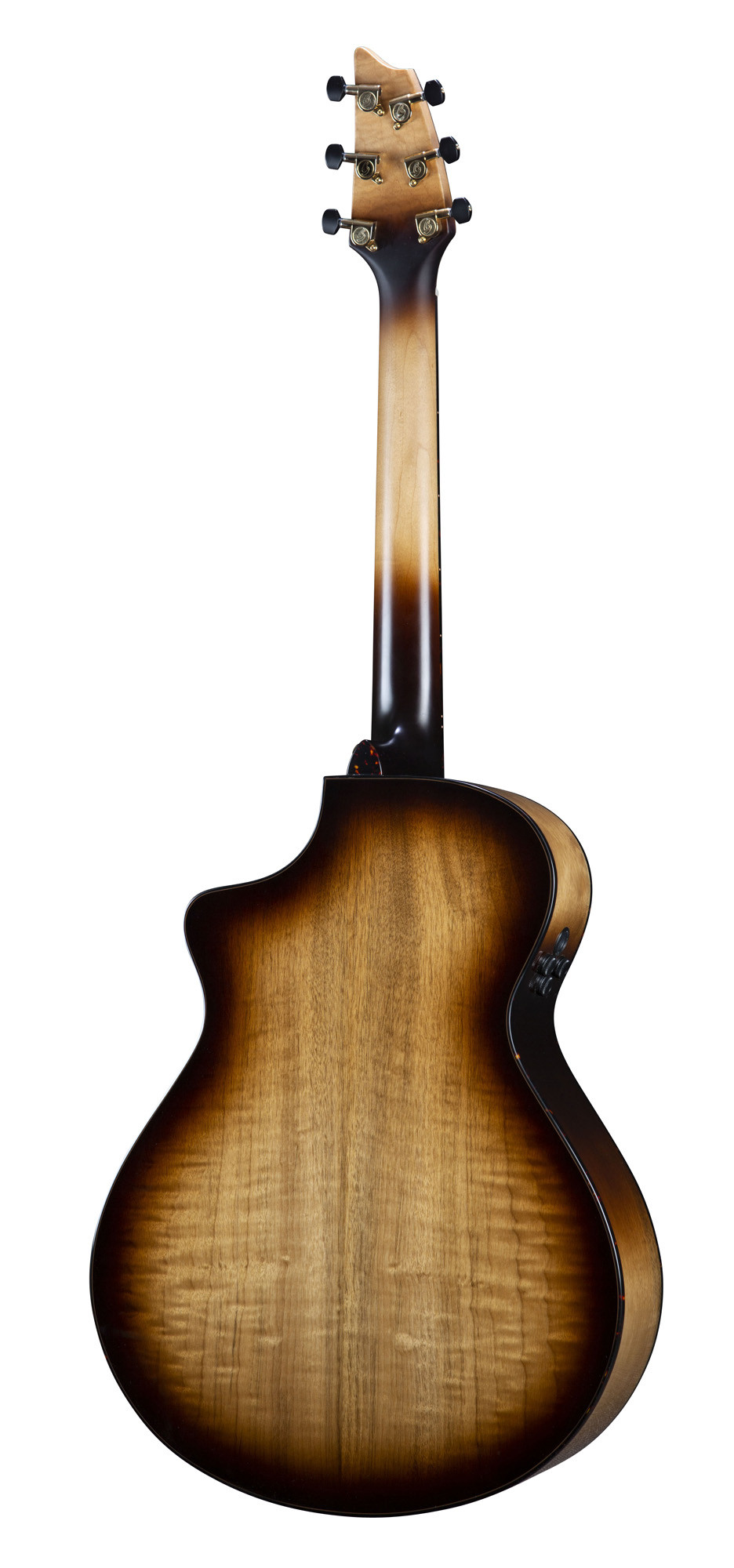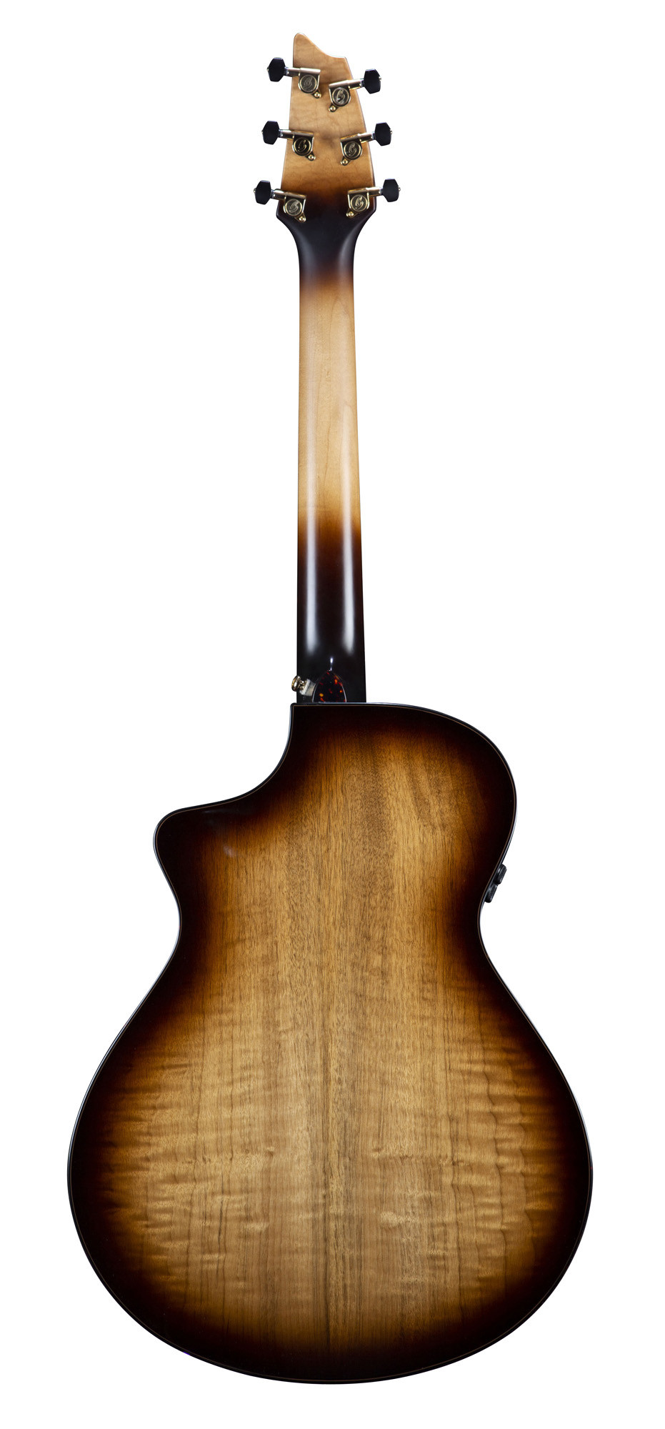 It features a solid European spruce top and a solid myrtlewood back and sides, tonewoods known for their projection and clarity potential. Its hard maple neck, ovangkol fingerboard and bridge, as well as its Tusq nuts and saddle, contribute to a stable and comfortable playing feel. The brass “offset dots” inlays, tortoise binding, and Premium Breedlove gold tuning machines add an elegant and distinctive finish.