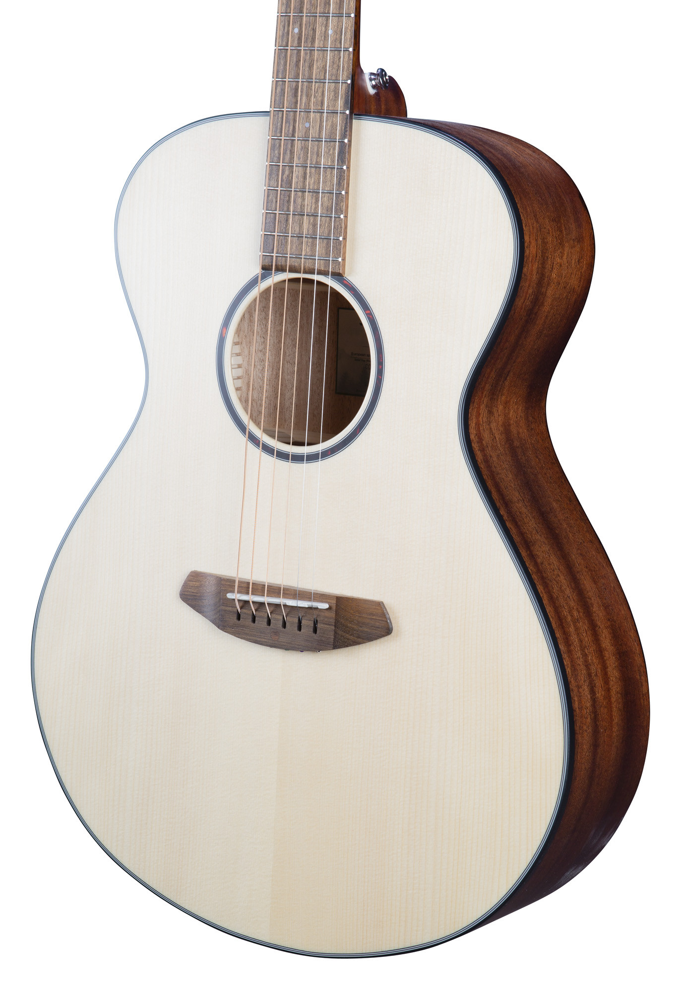 Top in solid European spruce, back and sides in mahogany, natural satin finish.