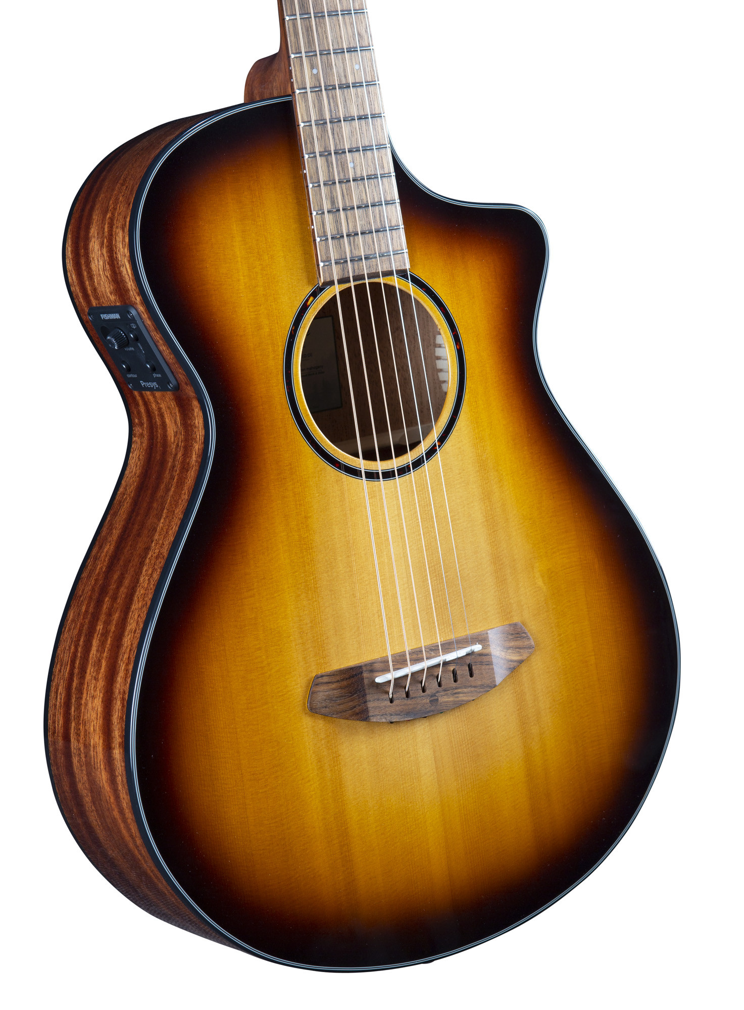 This model combines a solid red cedar top with mahogany back and sides to deliver a warm, balanced tone. Its edgeburst finish, cutaway, and Fishman Presys I electronics make it an instrument designed for both amplified playing and acoustic performance.