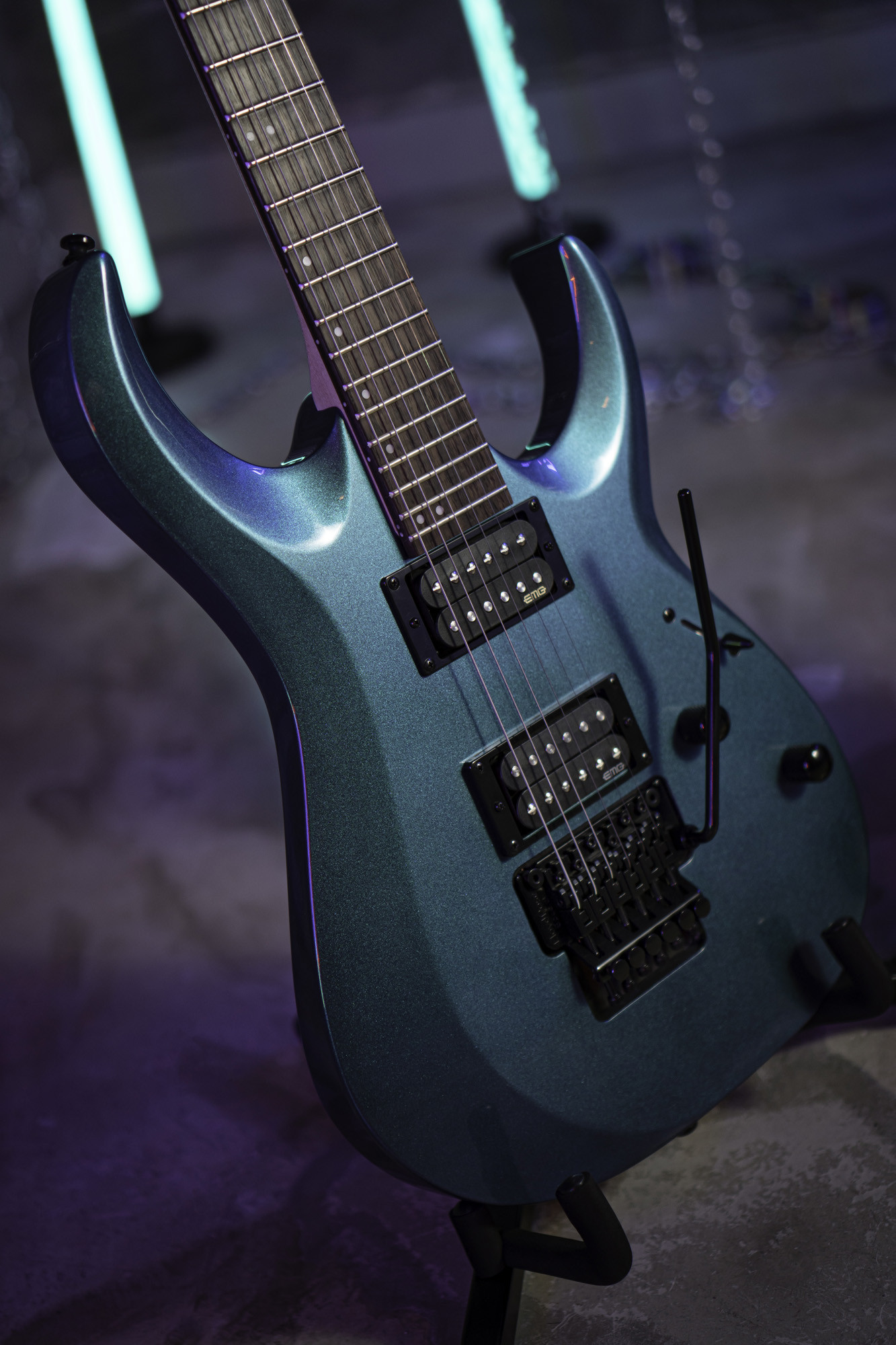 It stands out for its combination of 24 frets, two EMG RetroActive Hot70 pickups, a Floyd Rose tremolo, and a flip blue finish, making it a particularly complete and cohesive option in its category.