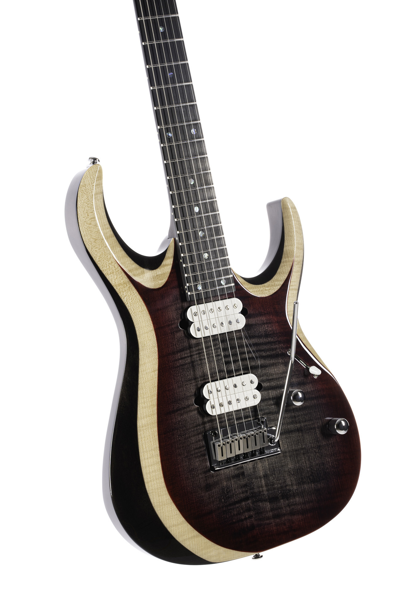 It offers construction combining mahogany, flamed maple, ebony, a 3-piece set neck, staggered locking tuners, and a CFA-III tremolo, with Fishman Fluence pickups for a wide variety of sounds.