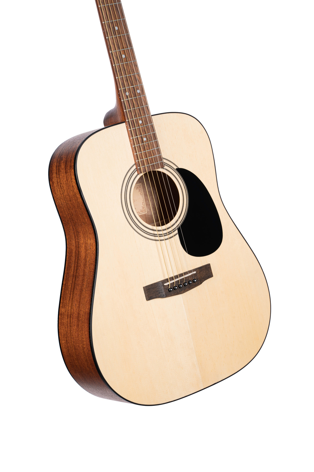 This Dreadnought guitar features a classic design intended for versatile use. Its spruce top provides good sound projection, while the mahogany back and sides contribute to a warm, balanced tone. The mahogany neck, combined with a merbau fingerboard and bridge, helps ensure comfortable handling and a coherent construction. Its natural open-pore finish highlights the instrument’s authentic look.