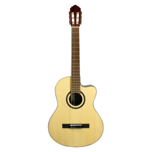 This acoustic guitar stands out for its careful design, combining a solid spruce top with mahogany back and sides. Its mahogany neck, ovangkol fingerboard, and 52 mm nut contribute to a comfortable feel suited to easy playing. The gloss natural finish highlights the look of the wood while giving it an elegant appearance.