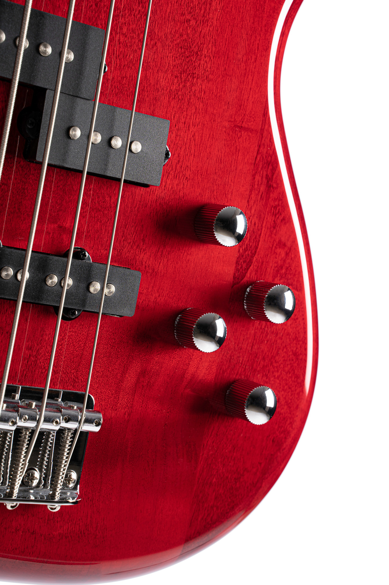 4 strings, poplar body, PJ Powersound pickups, 2-band active EQ, translucent red finish.