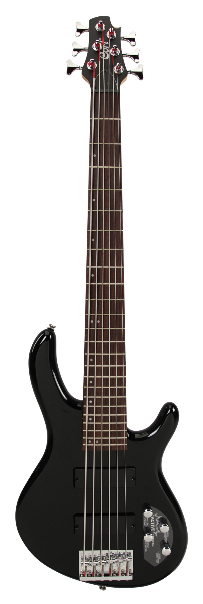 It stands out for its 6-string configuration, active 2-band electronics, Powersound pickups and glossy black finish, while offering a complete package with chrome hardware.