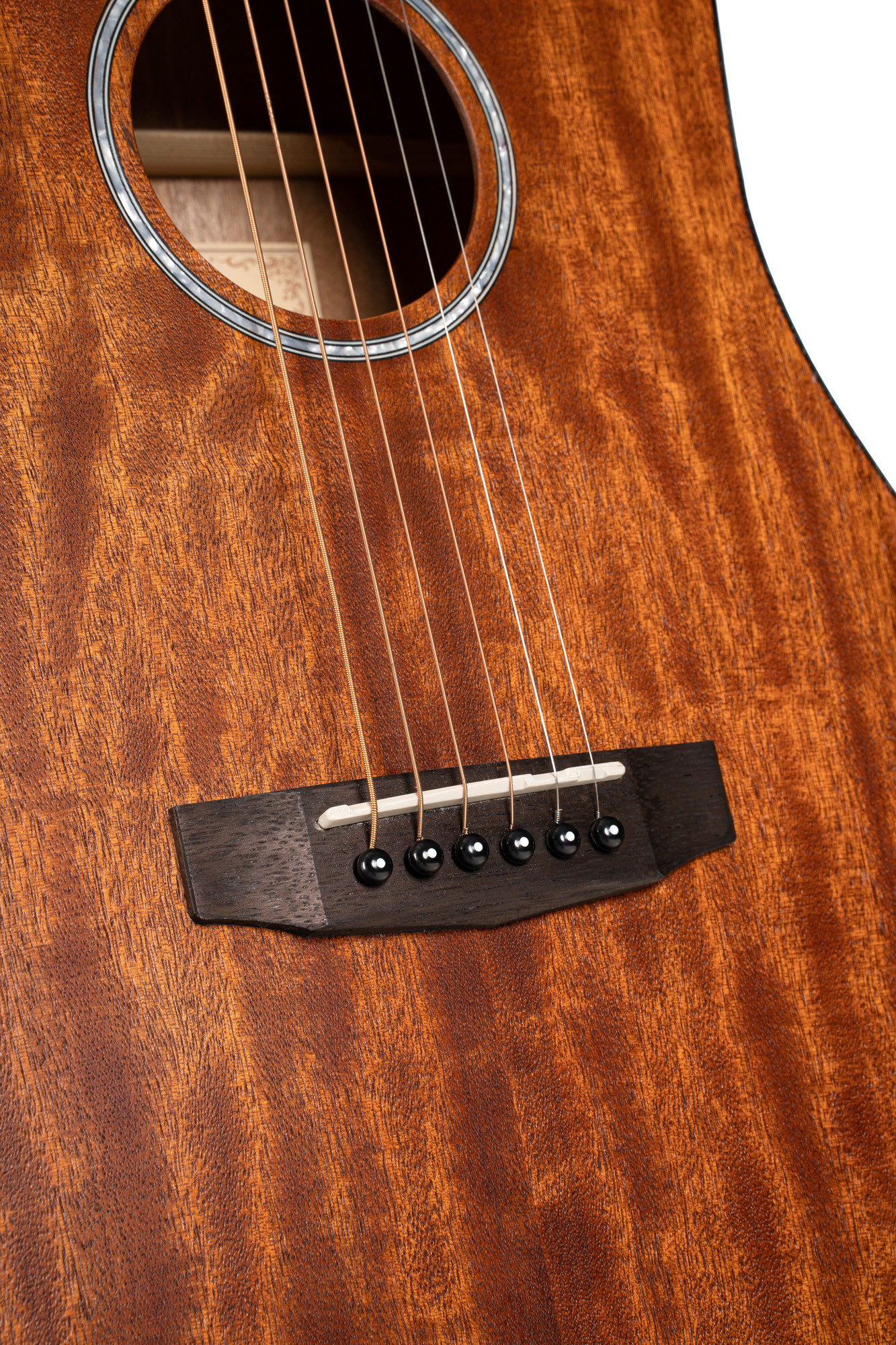 This 3/4 dreadnought guitar is designed to offer a compact and comfortable instrument, suited to those looking for an easy-to-handle model. It features a 579 mm scale length, a mahogany top, as well as a mahogany back and sides for a consistent construction. The merbau fingerboard and bridge, the 19 frets, and the 43 mm nut complete the package. The pearl-white rosette adds a refined finish. A gig bag is included.
